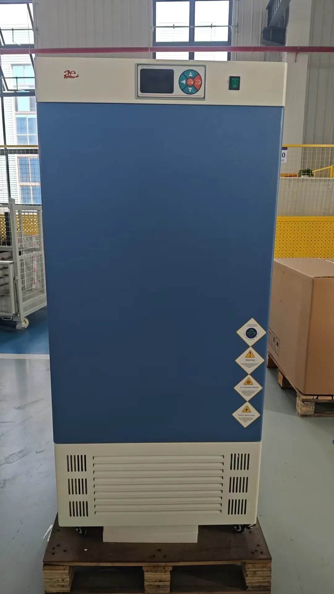 Features include a double screen and high luminance charactron display for direct viewing of set and actual values, adjustable shelf quantity and height, independent ultra-high temperature protection with working-state prompts, and environmentally friendly CFC-free refrigeration airflow.