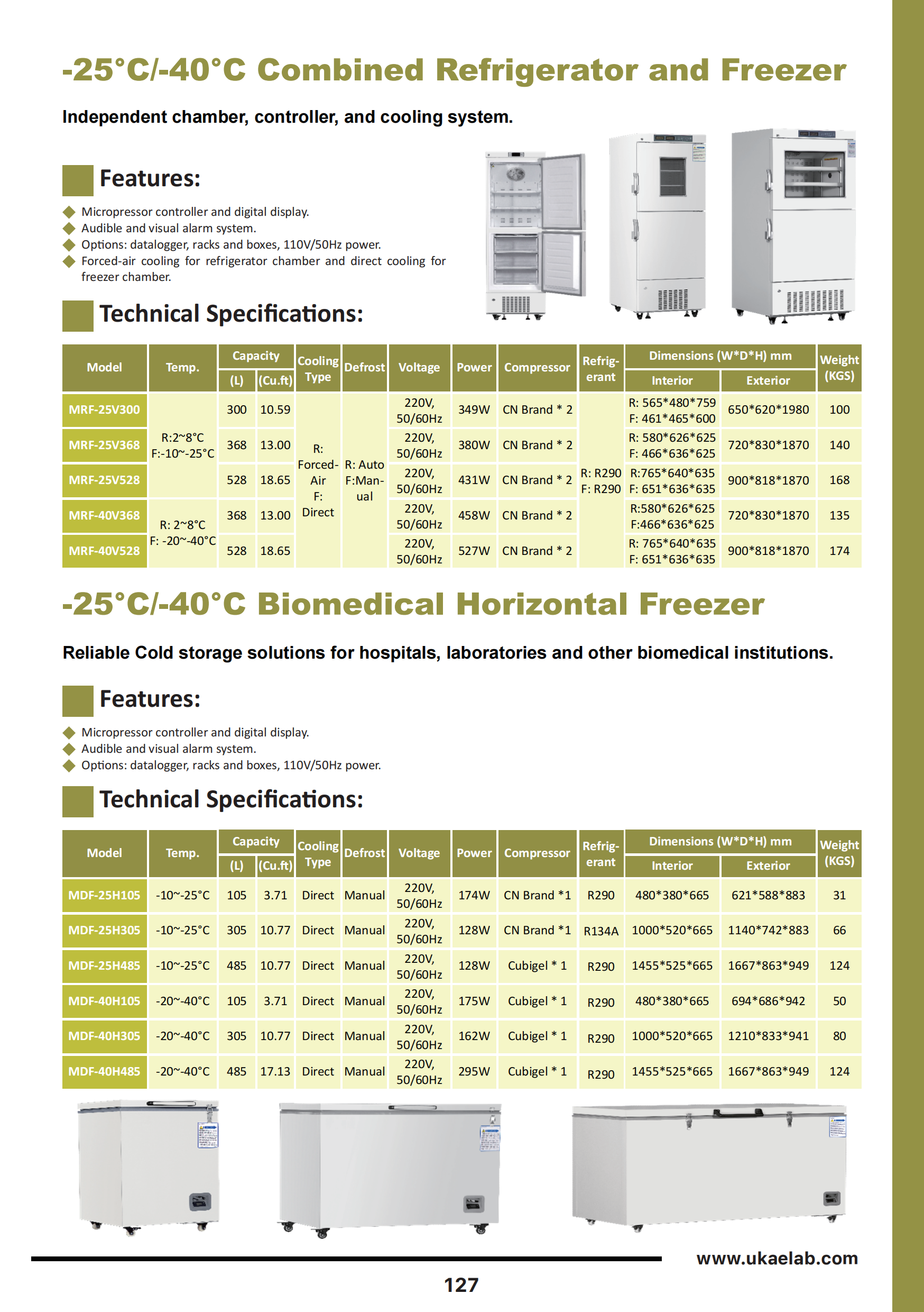 | Model | Temp. | Capacity | Cooling Type | Defrost | Voltage | Power | Compressor | Refrigerant | Dimensions (W*D*H) mm | Weight