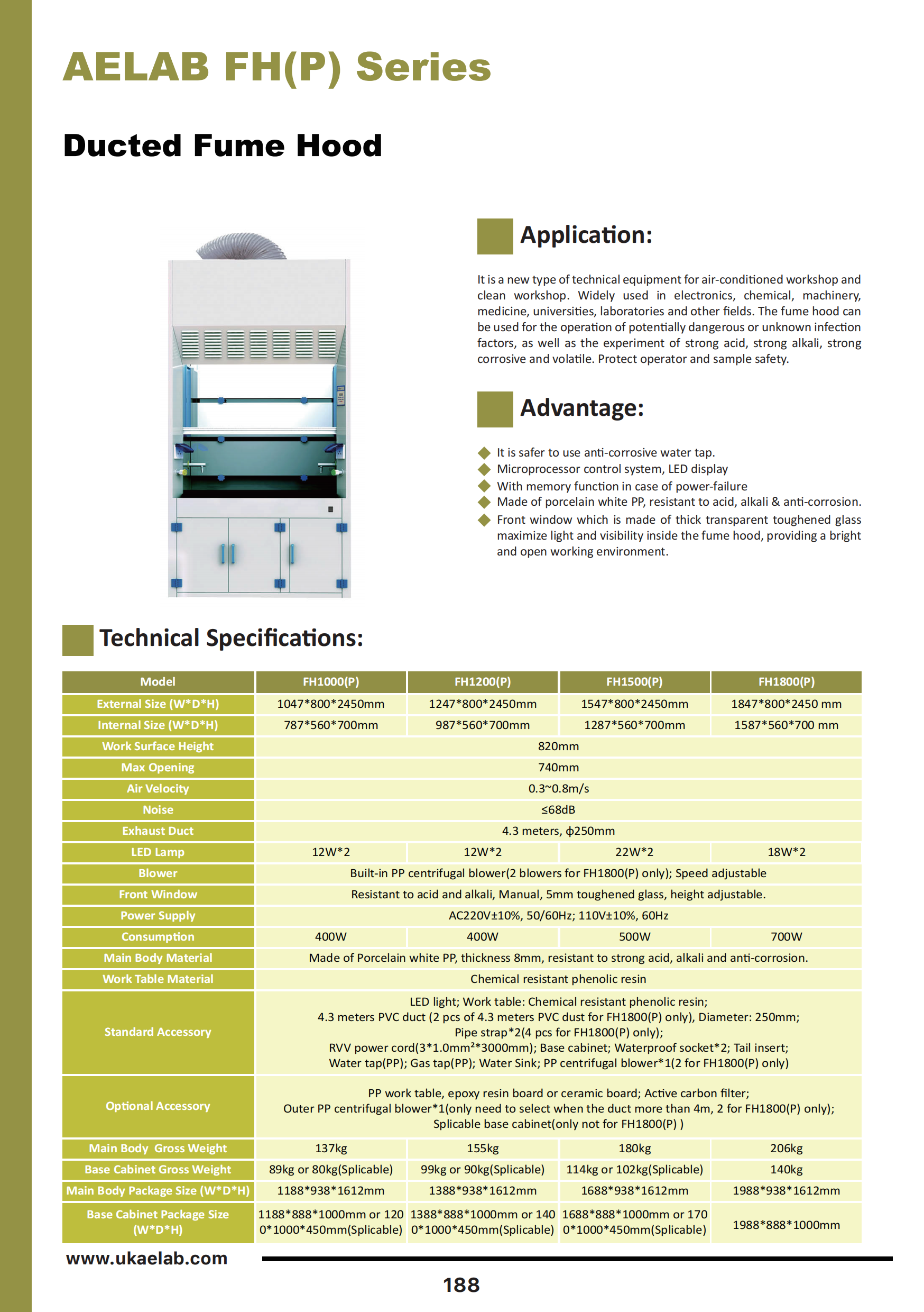 | Optional Accessory | PP work table; epoxy resin board or ceramic board; Active carbon filter; Outer PP centrifugal blower*1(only need to select when the duct more than 4m, 2 for FH1800(p) only) |