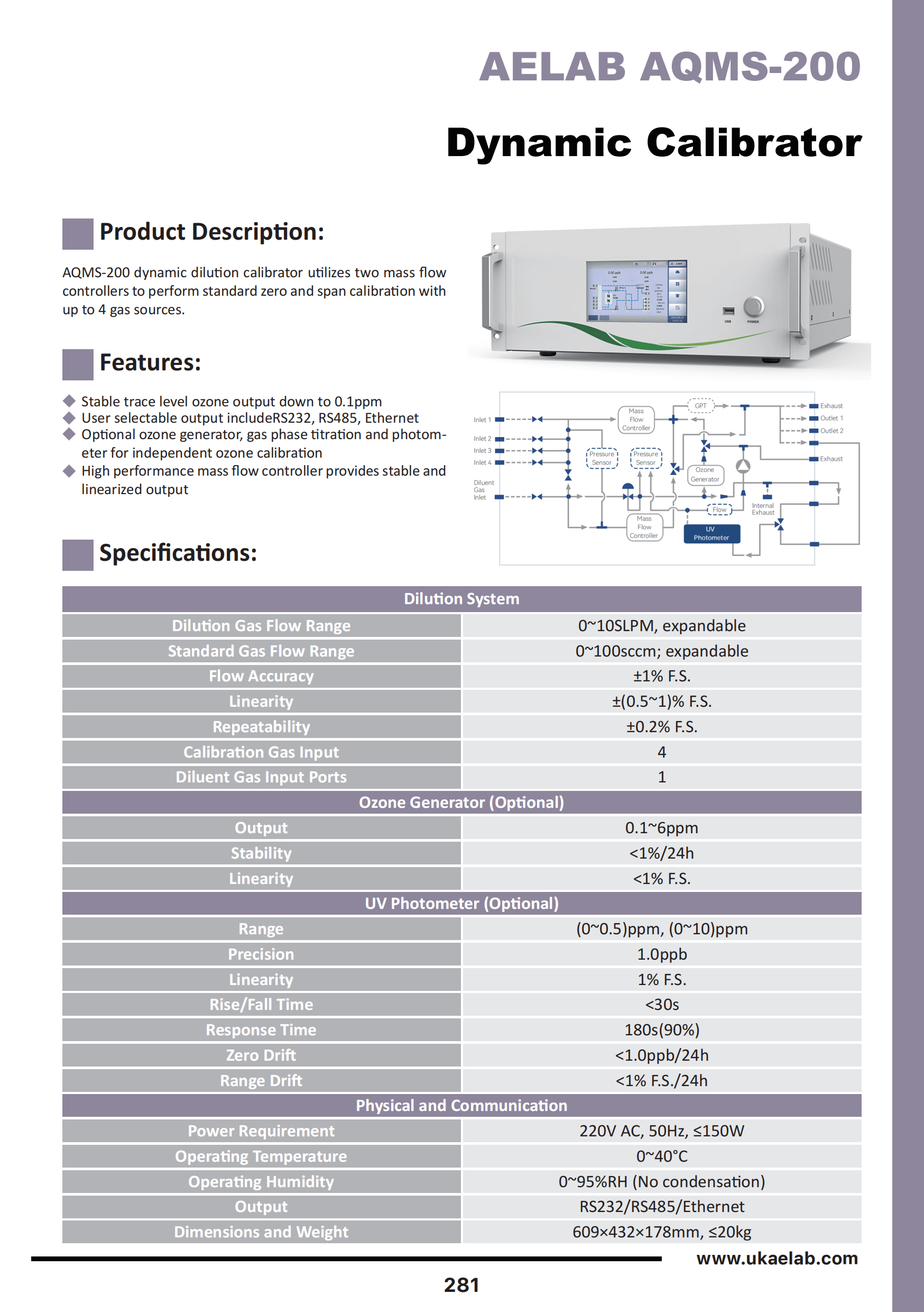 | AQMS-200 | 0~10SLPM dilution, 0~100sccm standard gas, optional 0.1~6ppm ozone generator, UV photometer (0~10ppm), RS232/RS485/Ethernet |
