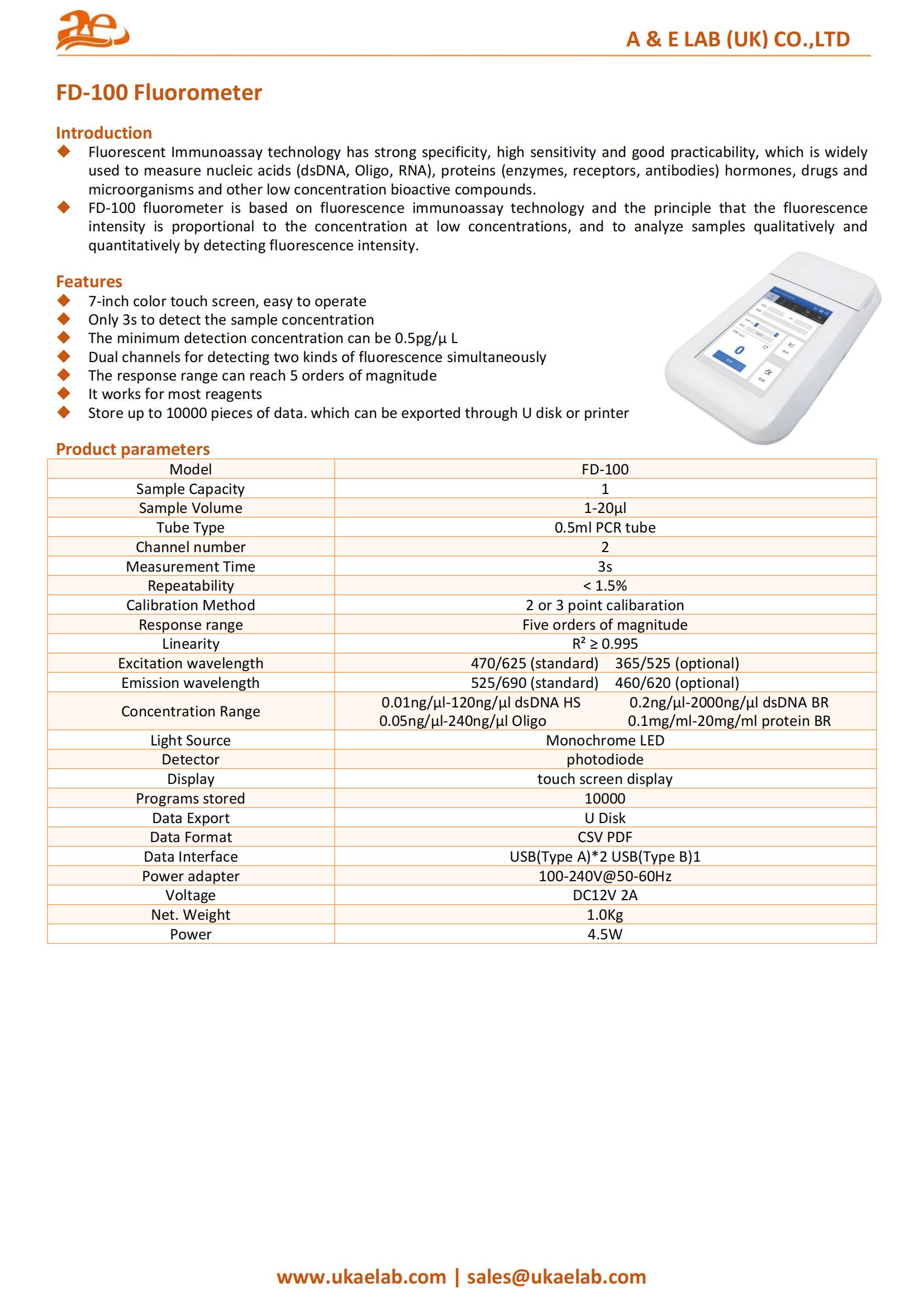 The AELAB FD-100 Fluorometer offers rapid and precise detection of nucleic acids, proteins, and other biomolecules using advanced fluorescence immunoassay technology. With dual-channel detection, ultra-high sensitivity, and intuitive touchscreen control, it’s designed for researchers demanding speed, accuracy, and ease of use in one compact device.