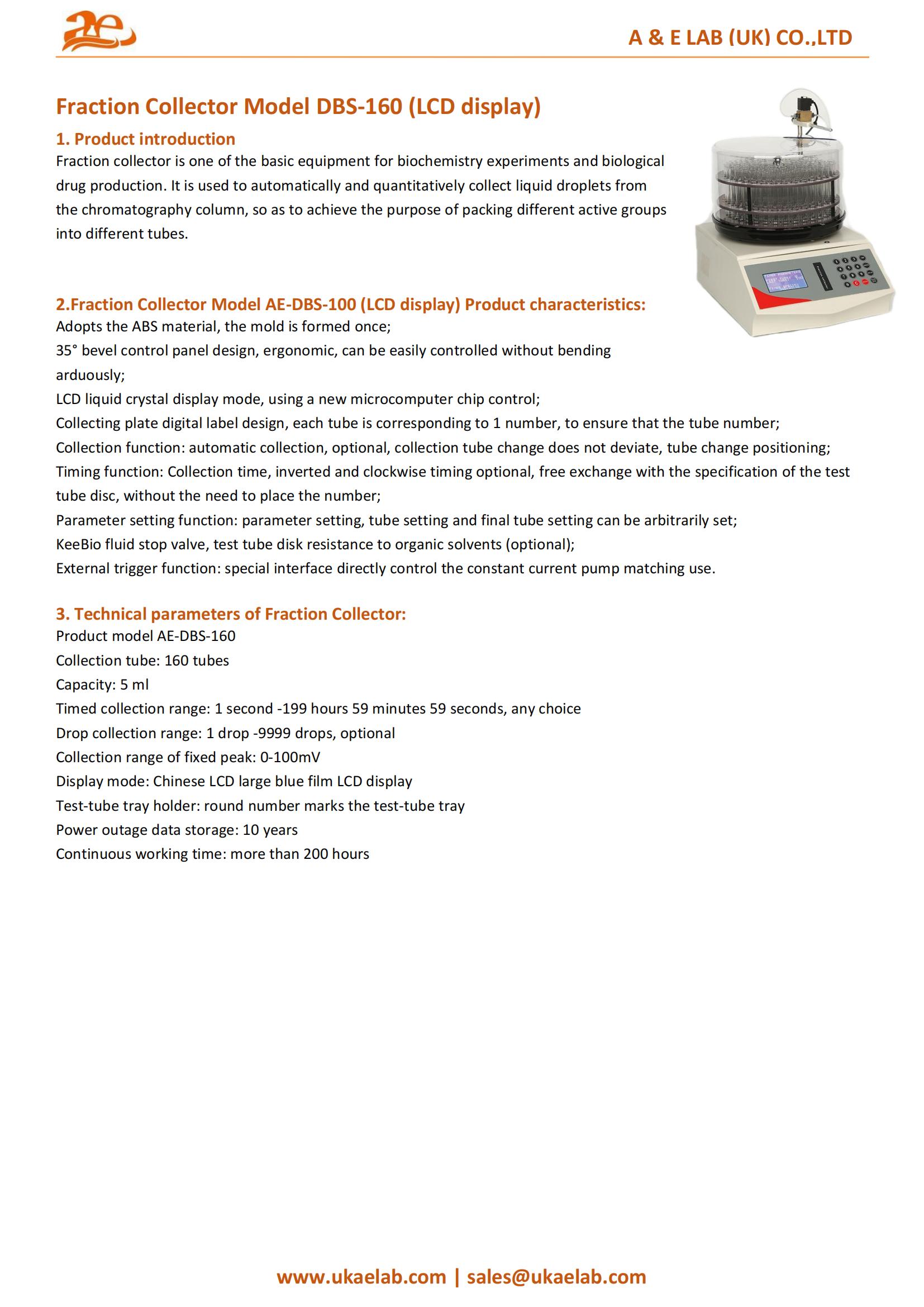 | AE-DBS-160 | 160 tubes, 5 ml capacity, 1 s–199 h 59 min 59 s timing range, 1–9999 drop collection, 0–100 mV fixed-peak range, LCD display, >200 h continuous operation |