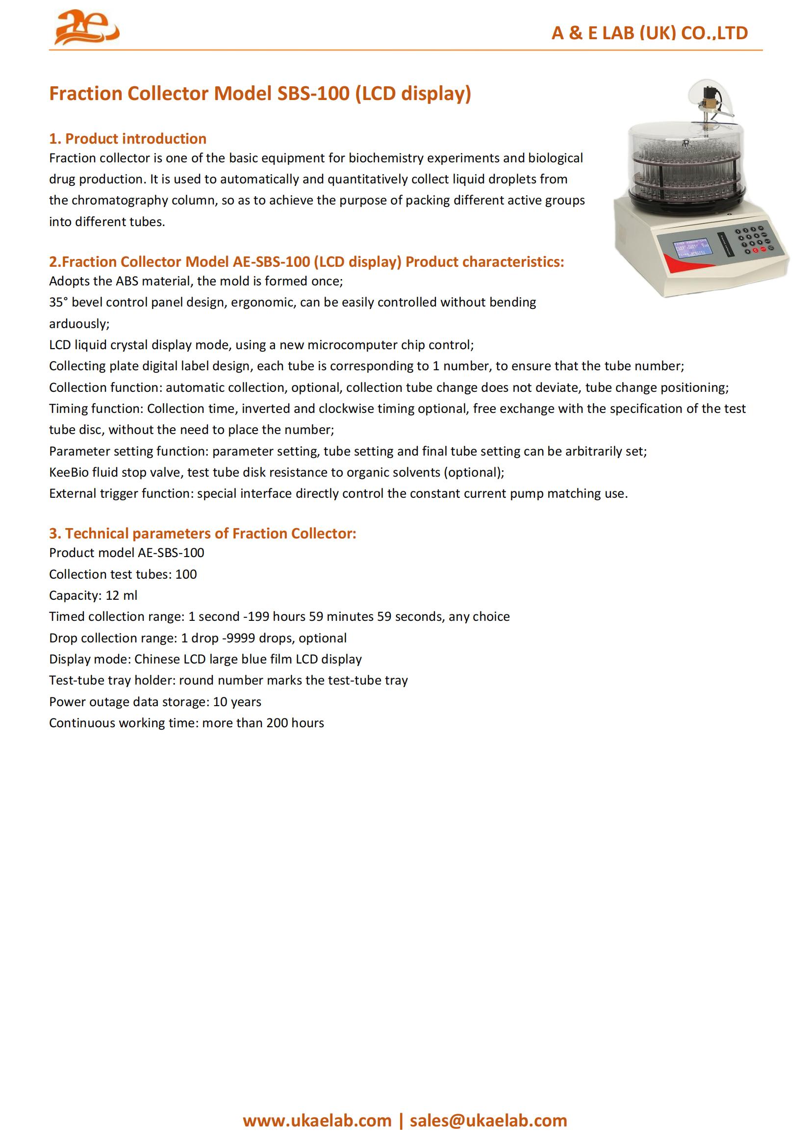 The AELAB Fraction Collector SBS-100 is one of the basic instruments for biochemistry and biological drug production experiments. It is used to automatically and quantitatively collect liquid droplets from the chromatography column, achieving the purpose of packing different active groups into different tubes.