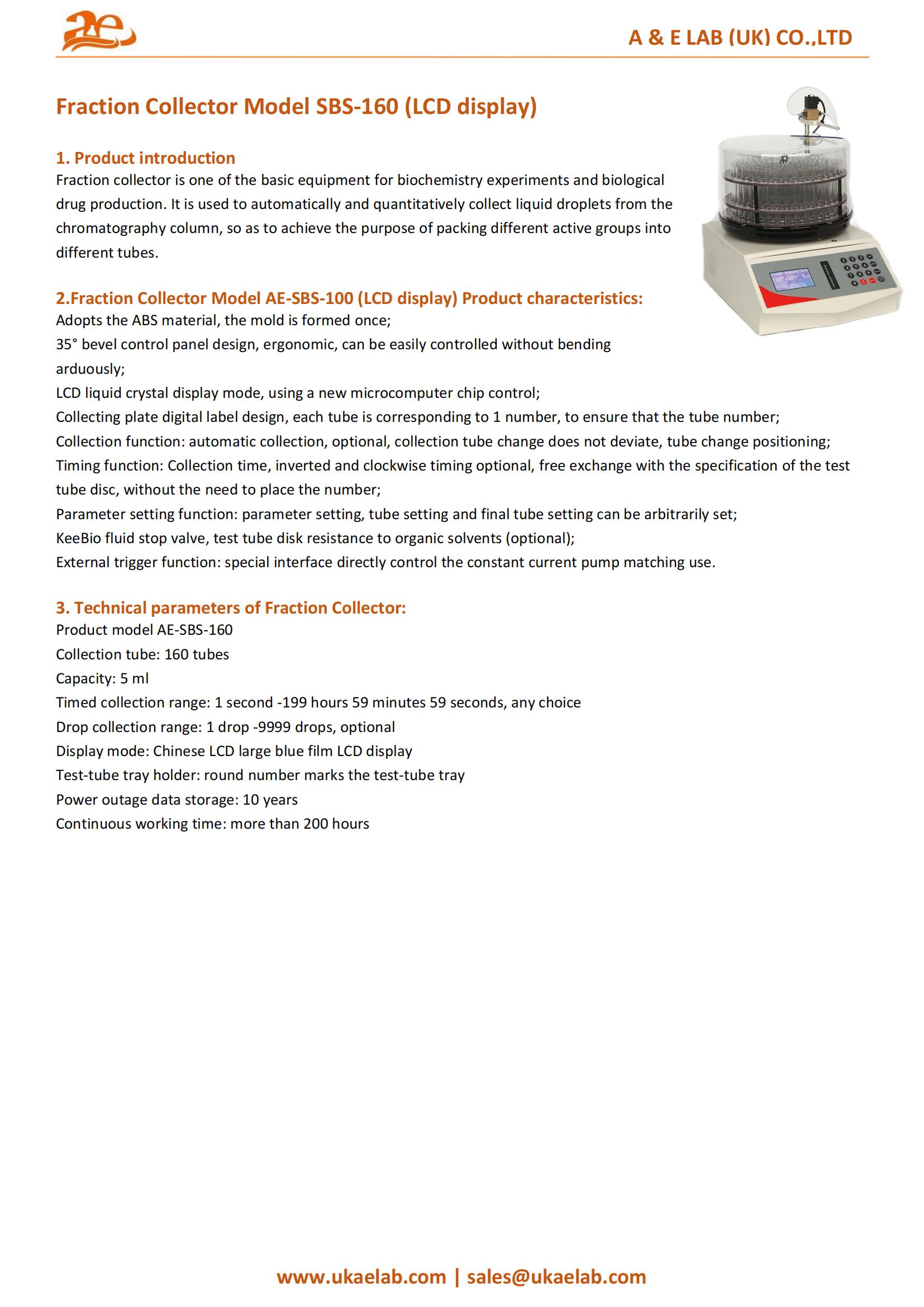 The AELAB SBS-160 Fraction Collector is suited for chromatographic separation, biochemical sample purification, protein fractionation, natural product isolation, and pharmaceutical research. It supports analytical and preparative chromatography workflows requiring consistent, quantifiable liquid collection.