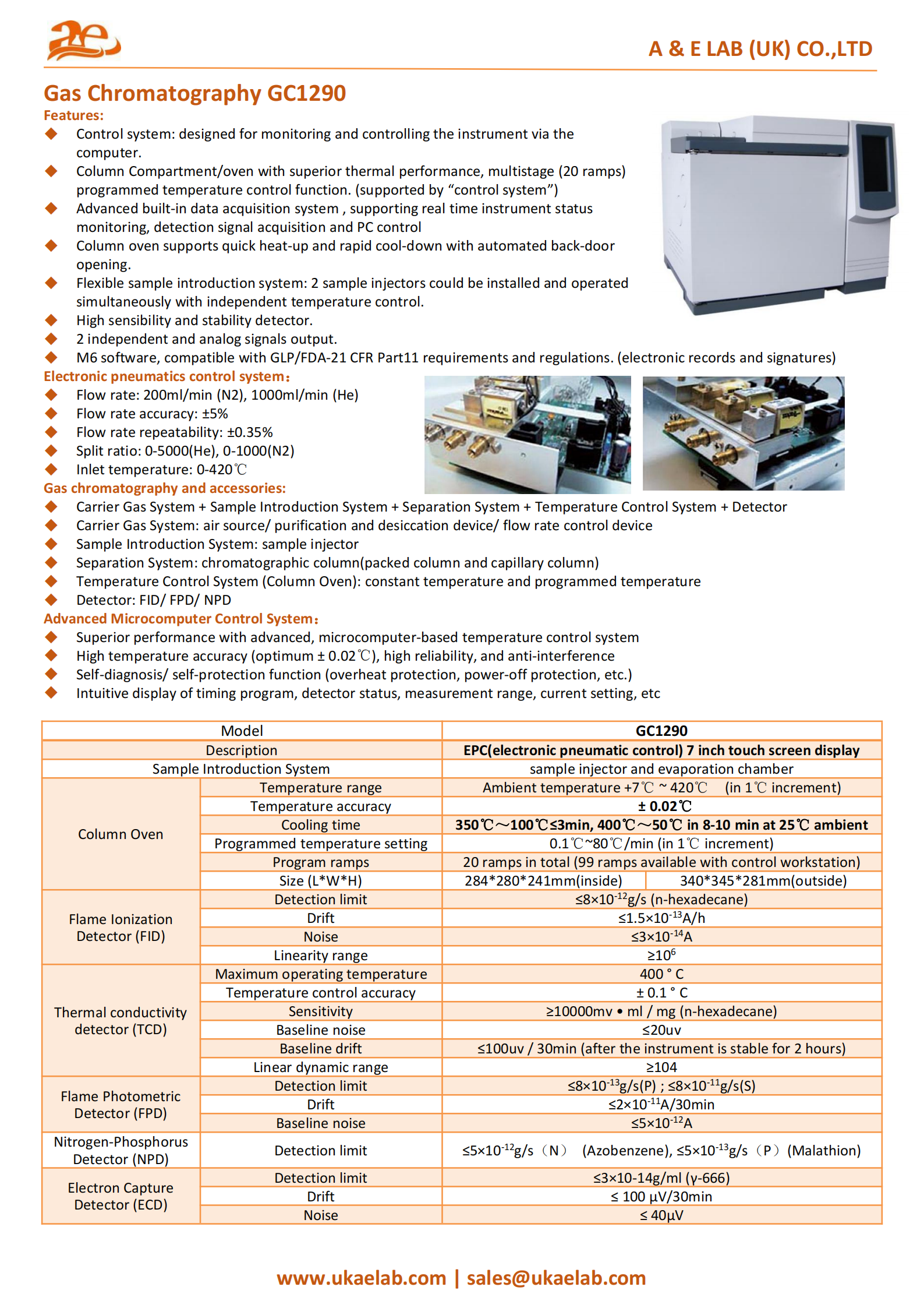 | GC1290 | Ambient temperature +7°C ~ 420°C range; EPC gas control; 20 program ramps; FID/TCD/FPD/NPD/ECD detector compatibility; 350°C→100°C ≤ 3 min cooling time; temperature accuracy ±0.02°C. |