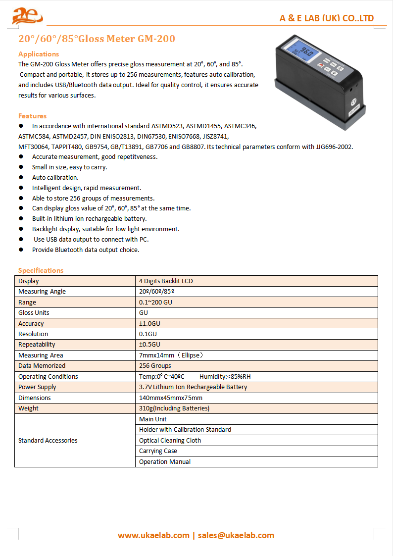 The AELAB GM-200 gloss meter is designed in accordance with multiple international and national gloss standards including ASTMD523, ASTMD1455, ASTMC346, ASTMC584, ASTMD2457, DIN ENISO2813, DIN67530, ENISO7668, JISZ8741, MFT30064, TAPPIT480, GB9754, GB/T13891, GB7706, and GB8807, with technical parameters conforming to JJG696-2002. The AELAB GM-200 supports auto calibration, rapid measurement, and data storage for structured surface gloss testing.