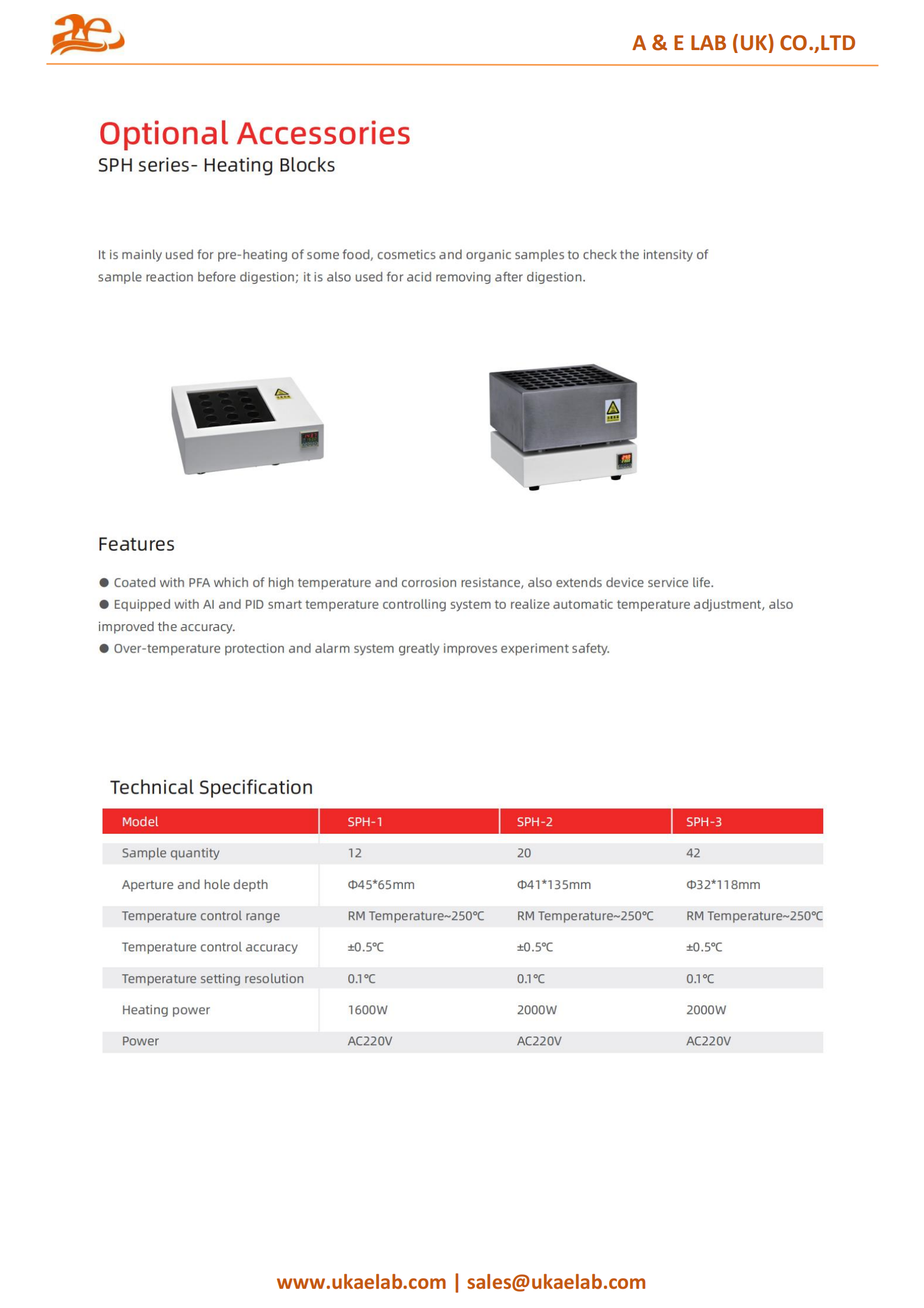 The SPH Series Heating Blocks are laboratory instruments designed for precise and controlled heating of samples, commonly used in fields like food, cosmetics, and organic sample analysis. These blocks feature multiple wells or cavities to hold sample containers, ensuring uniform heat distribution and efficient processing. They are primarily used for pre-heating samples before further procedures like digestion or reaction analysis, allowing researchers to observe sample reactions to temperature changes. Additionally, they are used for acid removal after digestion, ensuring samples are properly prepared for subsequent testing. With advanced temperature control, the SPH series provides precise heating within a specified range, ensuring optimal conditions for each sample. The blocks are made from durable materials that withstand high temperatures and resist corrosion from acids, offering safety features like over-temperature protection and automatic shut-off for safe operation. They are ideal for a wide range of applications, including chemical, biological, and environmental studies, where controlled heating is necessary for accurate and reproducible results.