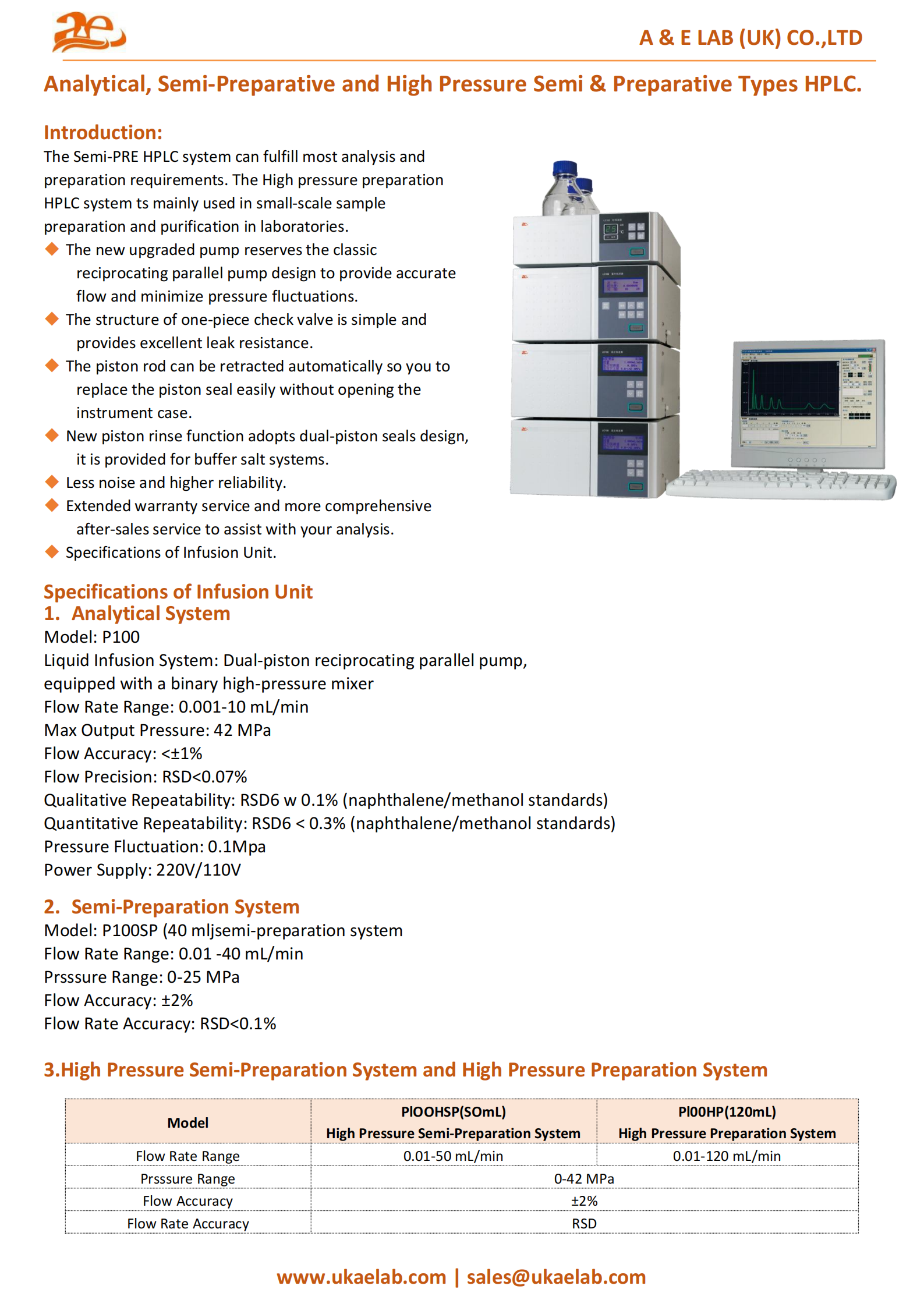 | P100HSP | 0.01–50 mL/min; 0–42 MPa; High pressure semi-preparative system |