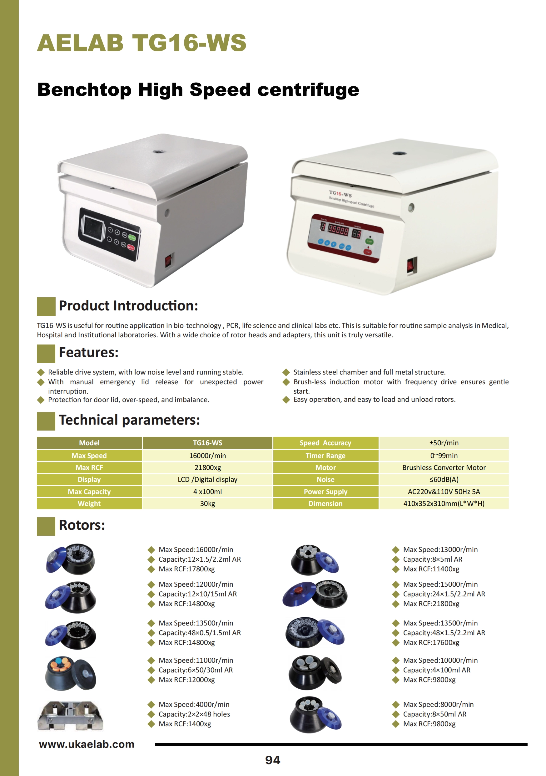 The AELAB TG16-WS is designed for rapid and precise centrifugation of biological and clinical samples. It is suitable for biotechnology, PCR, and life science laboratories, providing consistent performance for medical, hospital, and institutional research environments. With a wide range of rotor heads and adapters, the TG16-WS offers flexible sample processing for diverse tube sizes and volumes.