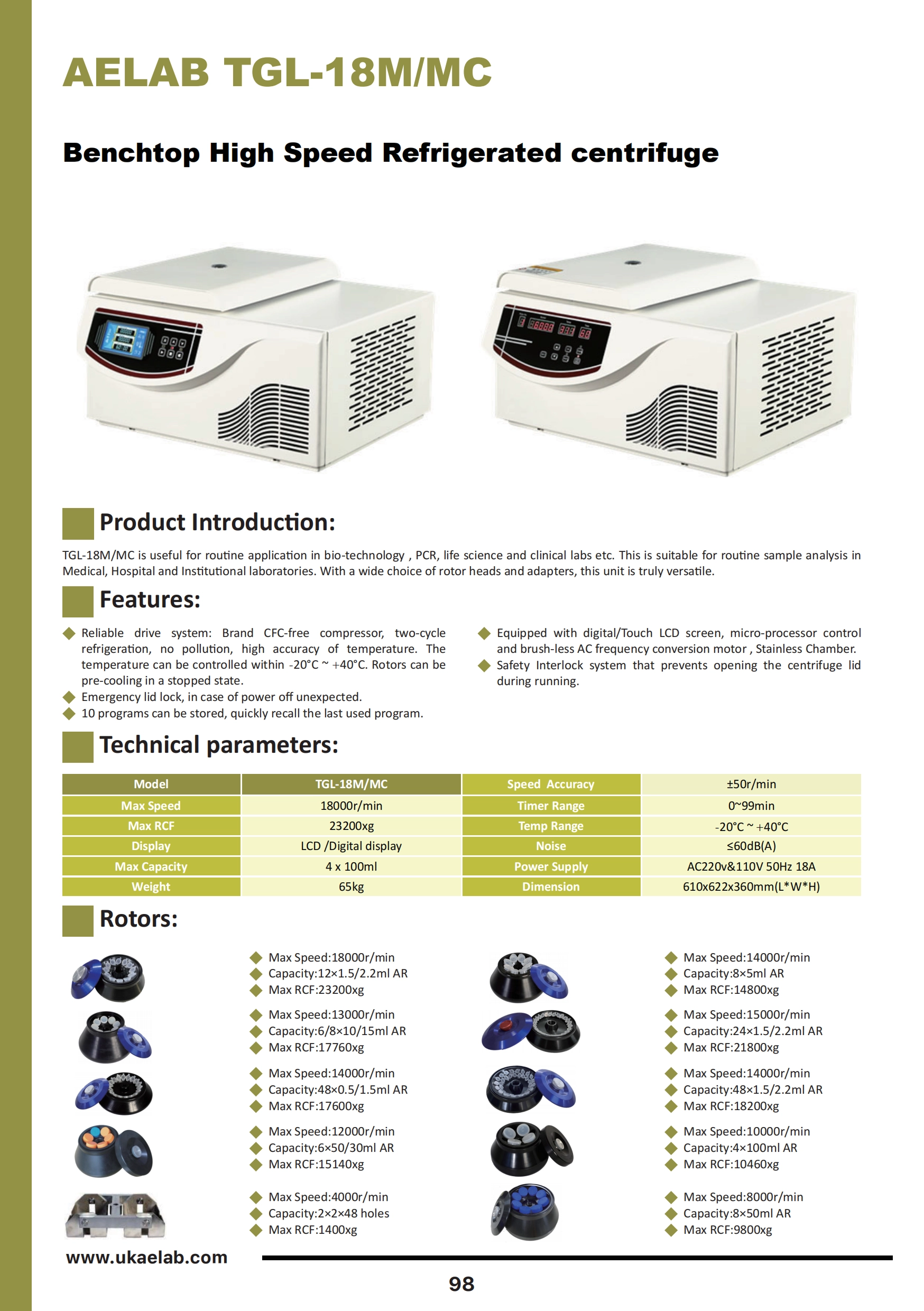 The AELAB TGL-18MC benchtop high speed refrigerated centrifuge is designed for routine laboratory centrifugation in bio-technology, PCR, life science, and clinical laboratories. The AELAB TGL-18MC supports routine sample analysis for medical, hospital, and institutional laboratory workflows with a wide choice of rotor heads and adapters for tube-based separation.