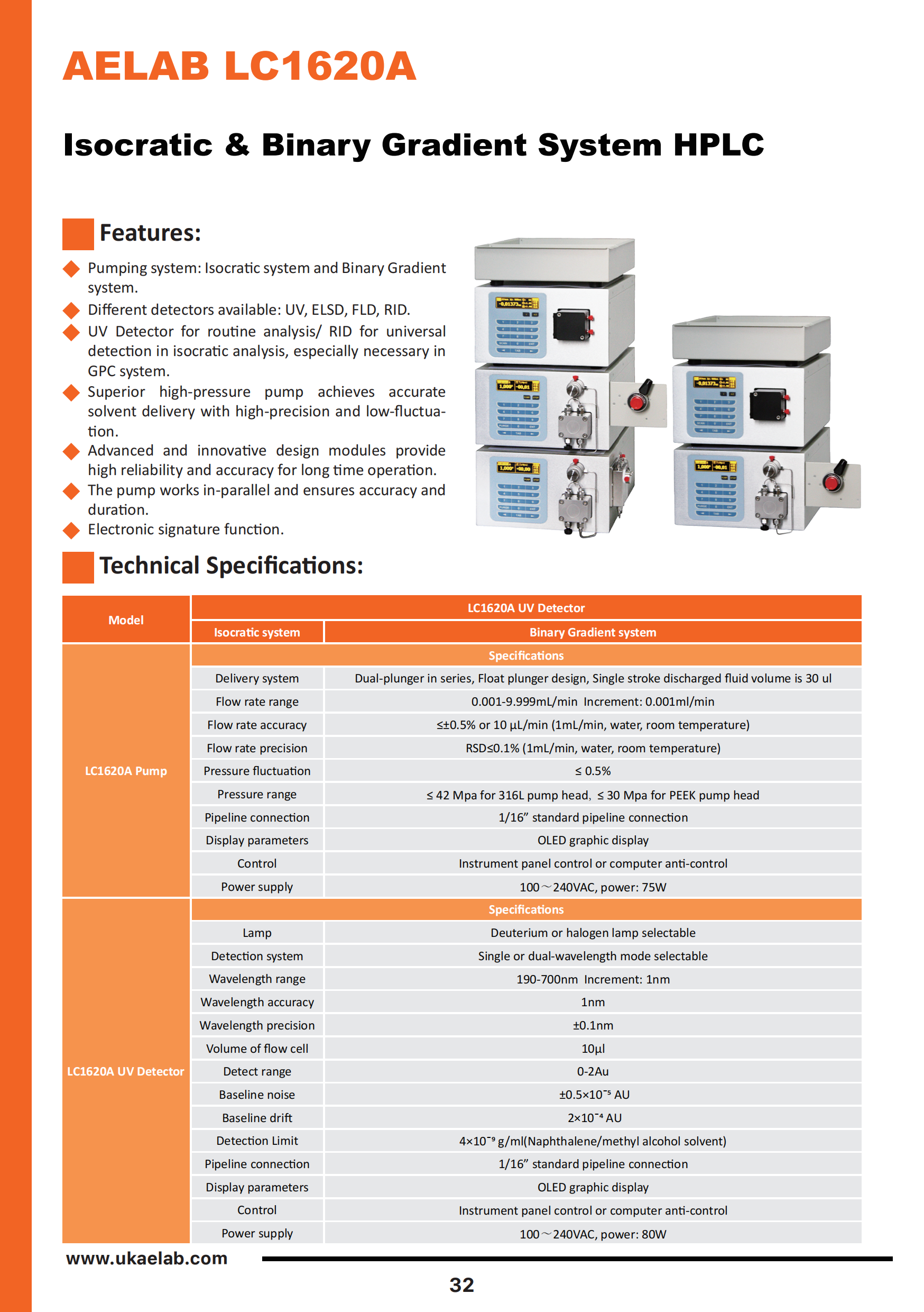 | LC1620A – Binary Gradient System | Dual-plunger gradient pump, 0.001–9.999 ml/min, UV detection, 30 MPa PEEK head |