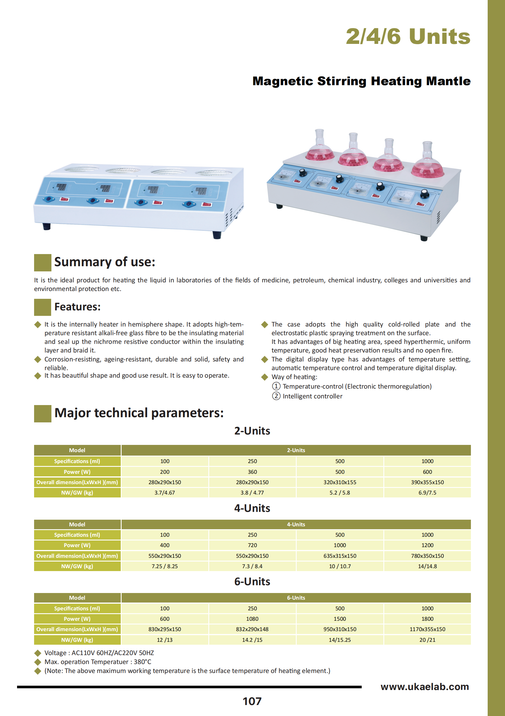 The 2-6 Units Magnetic Stirring Heating Mantle is a compact, versatile laboratory instrument designed for simultaneously heating and stirring up to six containers, offering precise temperature control, magnetic stirring for uniform mixing, and safety features like over-temperature protection, making it ideal for use in medicine, petroleum, chemical industries, environmental protection, and academic research.