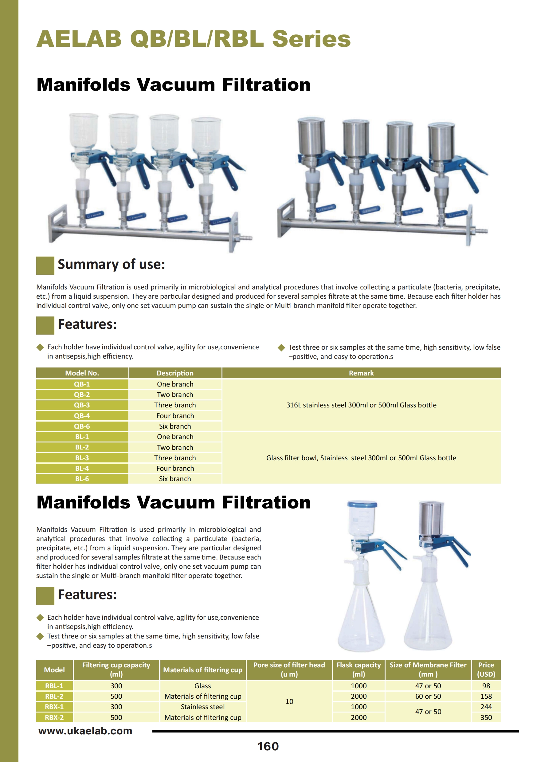 Manifolds Vacuum Filtration is used primarily in microbiological and analytical procedures that involve collecting a particulate (bacteria, precipitate, etc.) from a liquid suspension. They are particular designed and produced for several samples filtrate at the same time. Because each filter holder has individual control valve, only one set vacuum pump can sustain the single or Multi-branch manifold filter operate together.