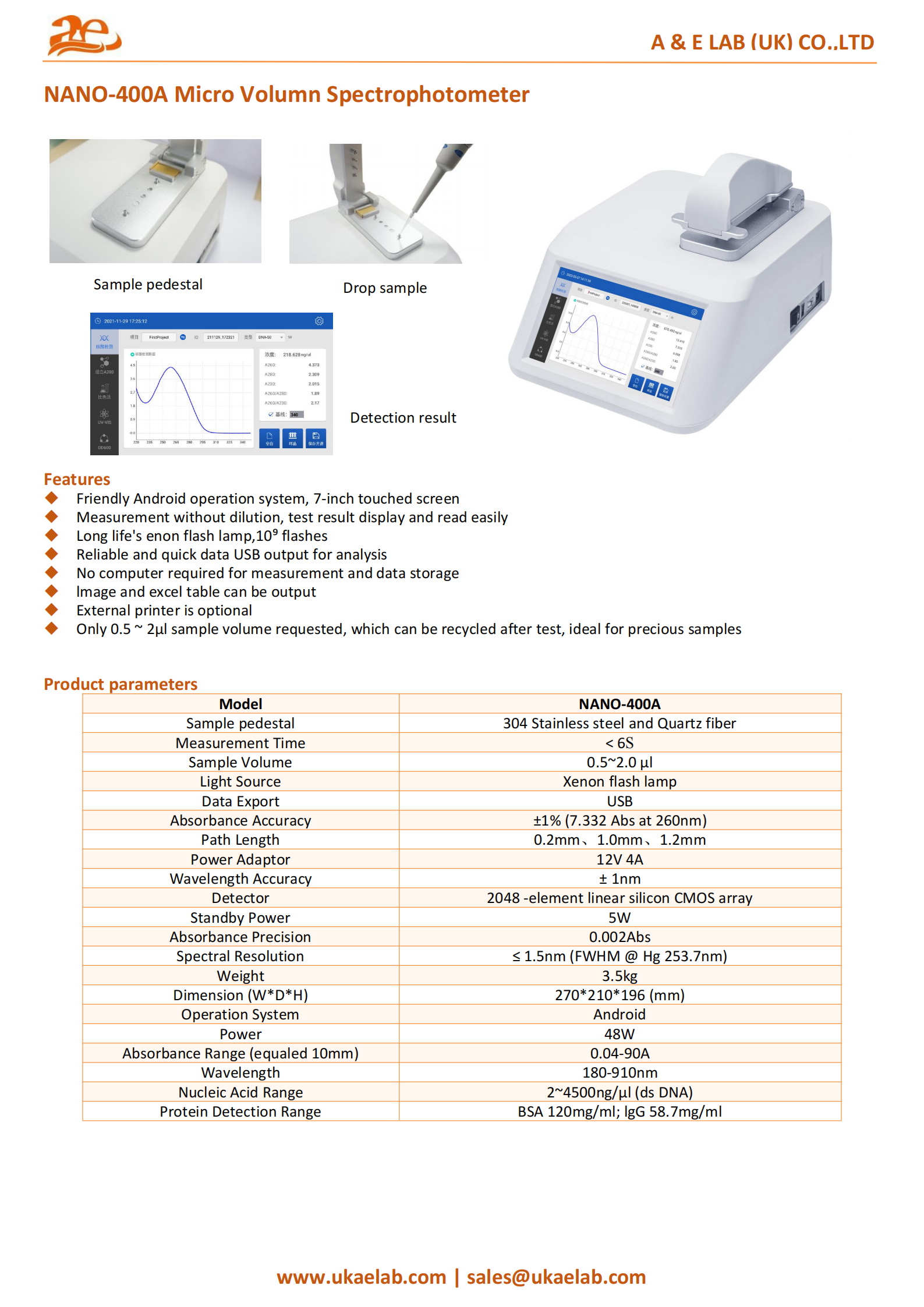 The AELAB Micro Volume Spectrophotometer NANO-400A is engineered for precise measurement of nucleic acids, proteins, and other micro-samples. Featuring advanced optics, Android-based operation, and ultra-low sample volume requirements, it delivers quick, reliable, and accurate spectroscopic data—making it ideal for modern research and quality control laboratories.