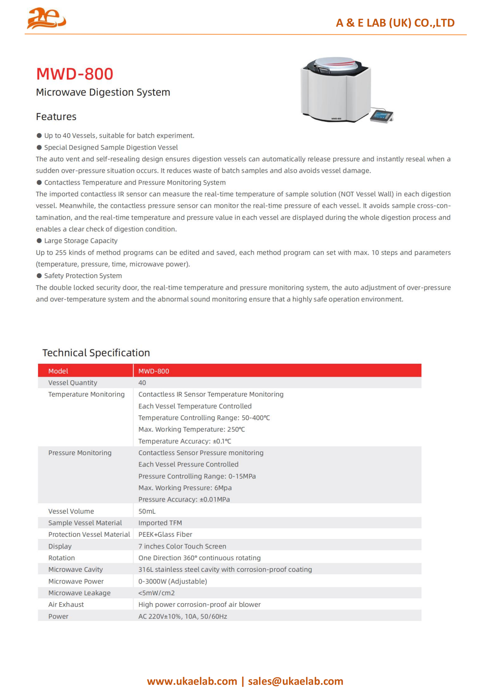 The MWD-800 Microwave Digestion System supports up to 40 vessels for batch experiments. It features auto venting, self-resealing digestion vessels for safety, and contactless IR and pressure sensors for real-time monitoring of temperature and pressure. With storage for up to 255 customizable method programs and a built-in safety protection system, it ensures efficient, reliable, and secure sample digestion.