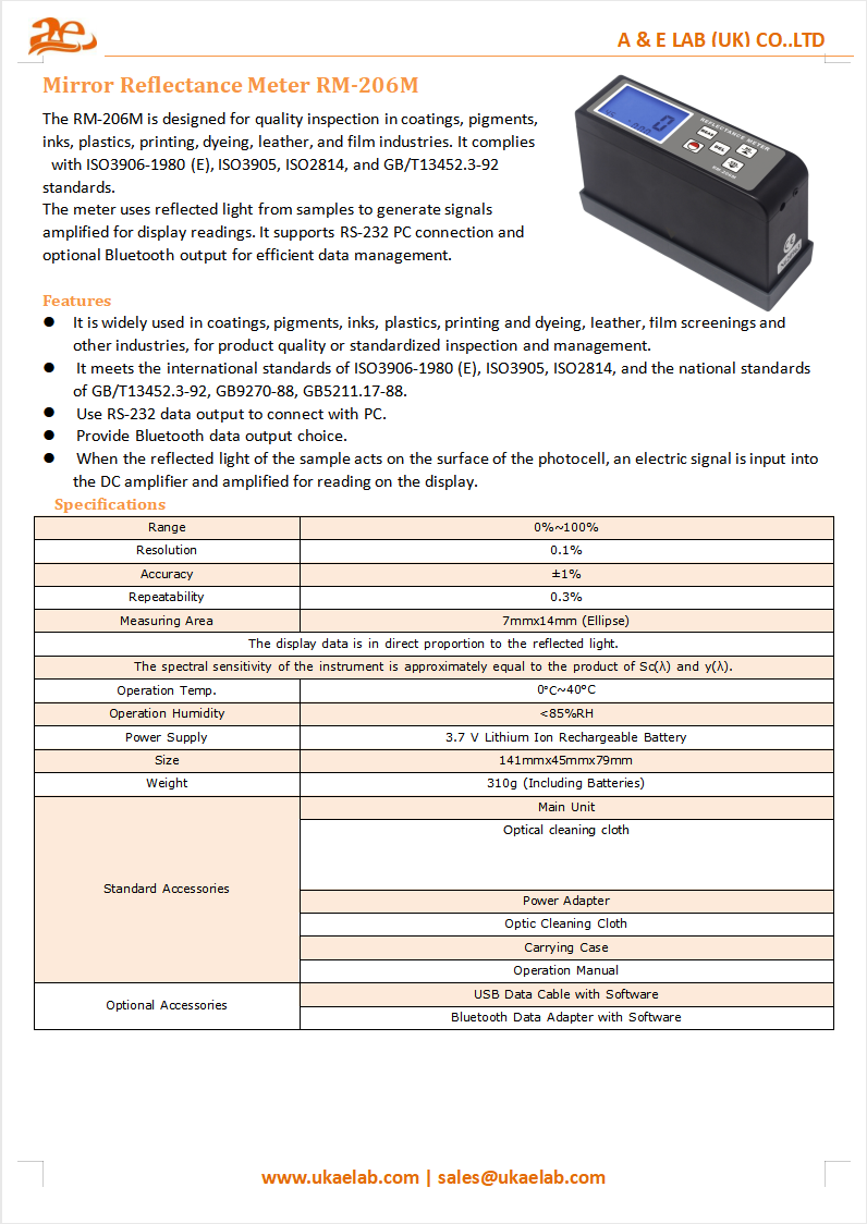 The Mirror Reflectance Meter RM-206M is a versatile instrument widely used in industries such as coatings, pigments, inks, plastics, printing, dyeing, leather, and film screening. It is ideal for quality control, product inspection, and standardization processes.