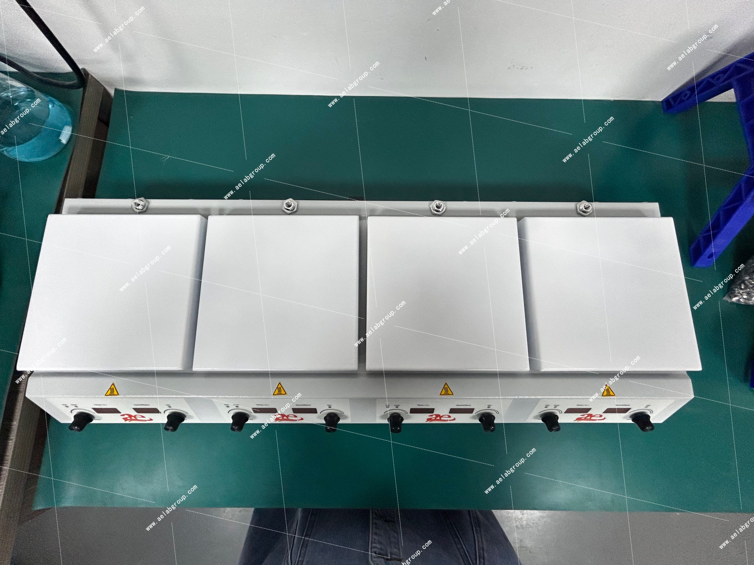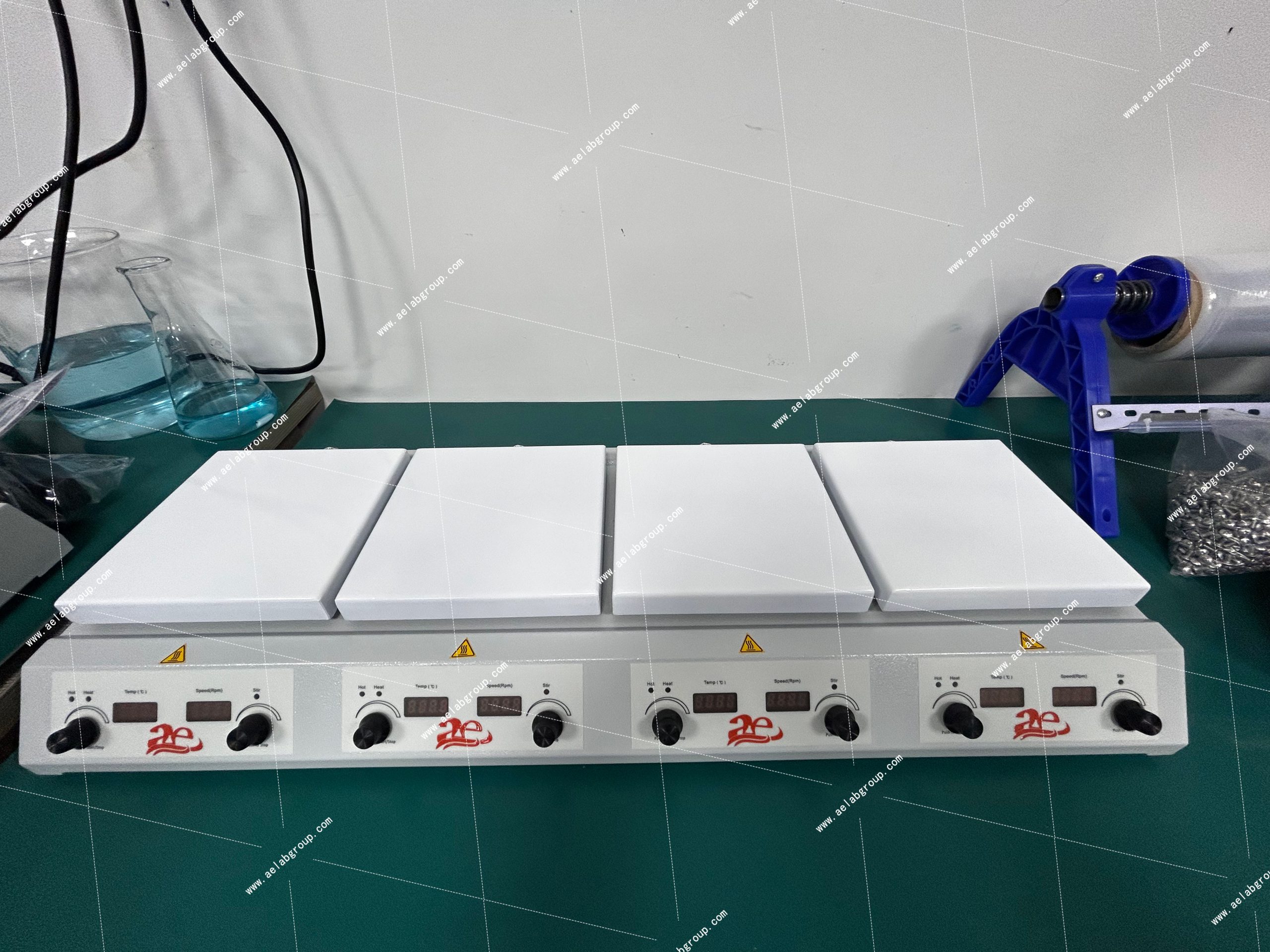 The Multi-Plates Magnetic Stirrer Hotplate HSHS-4P Series is a compact, four-position lab device designed for simultaneous heating and stirring. With plates measuring 178×178 mm, it provides precise heating up to 500°C and stirring speeds of 150–1600 rpm. Each position operates independently, allowing customization for different experiments. The unit includes three plate material options (ceramic-coated stainless steel, aluminum, pure ceramic) and offers accurate temperature control with ±0.5°C precision using the PT 1000 sensor. Safety features like overheat, hot surface, and residual temperature warnings enhance user protection. Designed for global use, it supports 200–240V, 50/60 Hz, making it a versatile tool for laboratories worldwide.