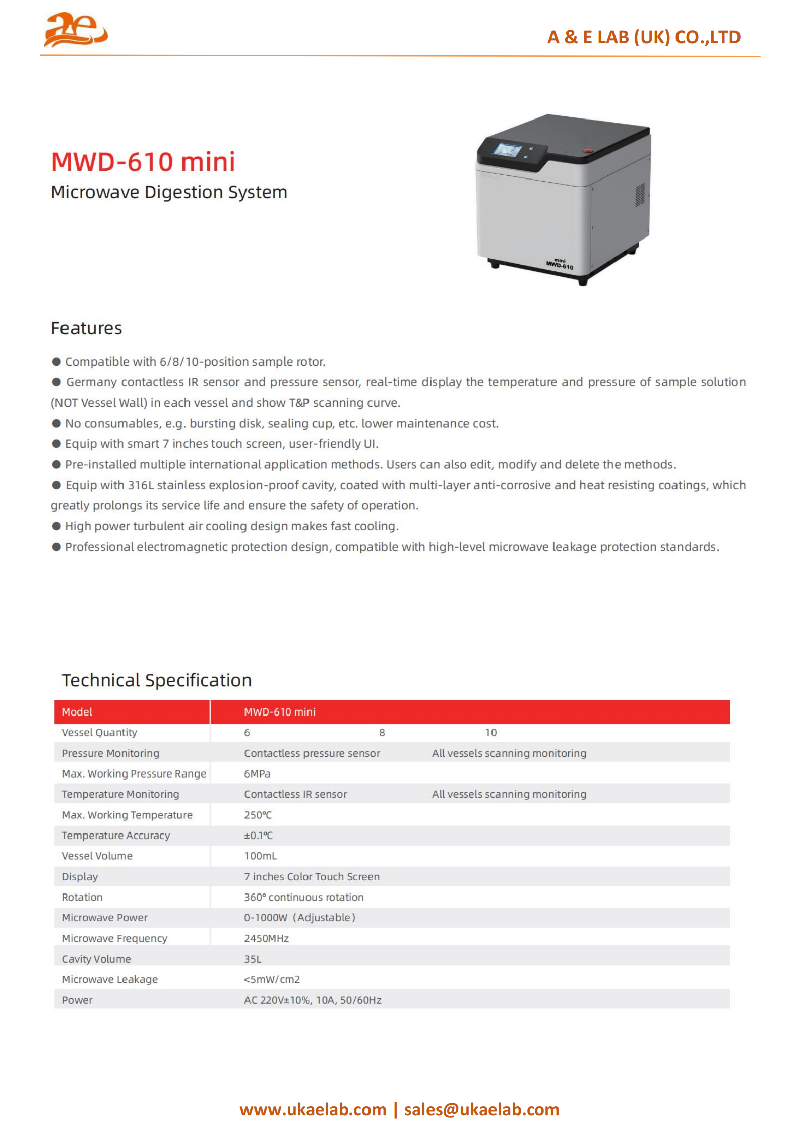 The MWD-610 Mini Microwave Digestion System offers high-performance sample processing with a 6, 8, or 10-position rotor. It features Germany-made contactless IR and pressure sensors for real-time monitoring of temperature and pressure, displaying T&P scanning curves. With no consumables needed, it reduces maintenance costs. The 7-inch touchscreen provides easy control, and pre-installed international methods are customizable. Its 316L stainless steel explosion-proof cavity with anti-corrosive coatings ensures safety and durability. The system also includes high-power air cooling and electromagnetic protection for microwave safety, making it a reliable, cost-effective solution for laboratory use.