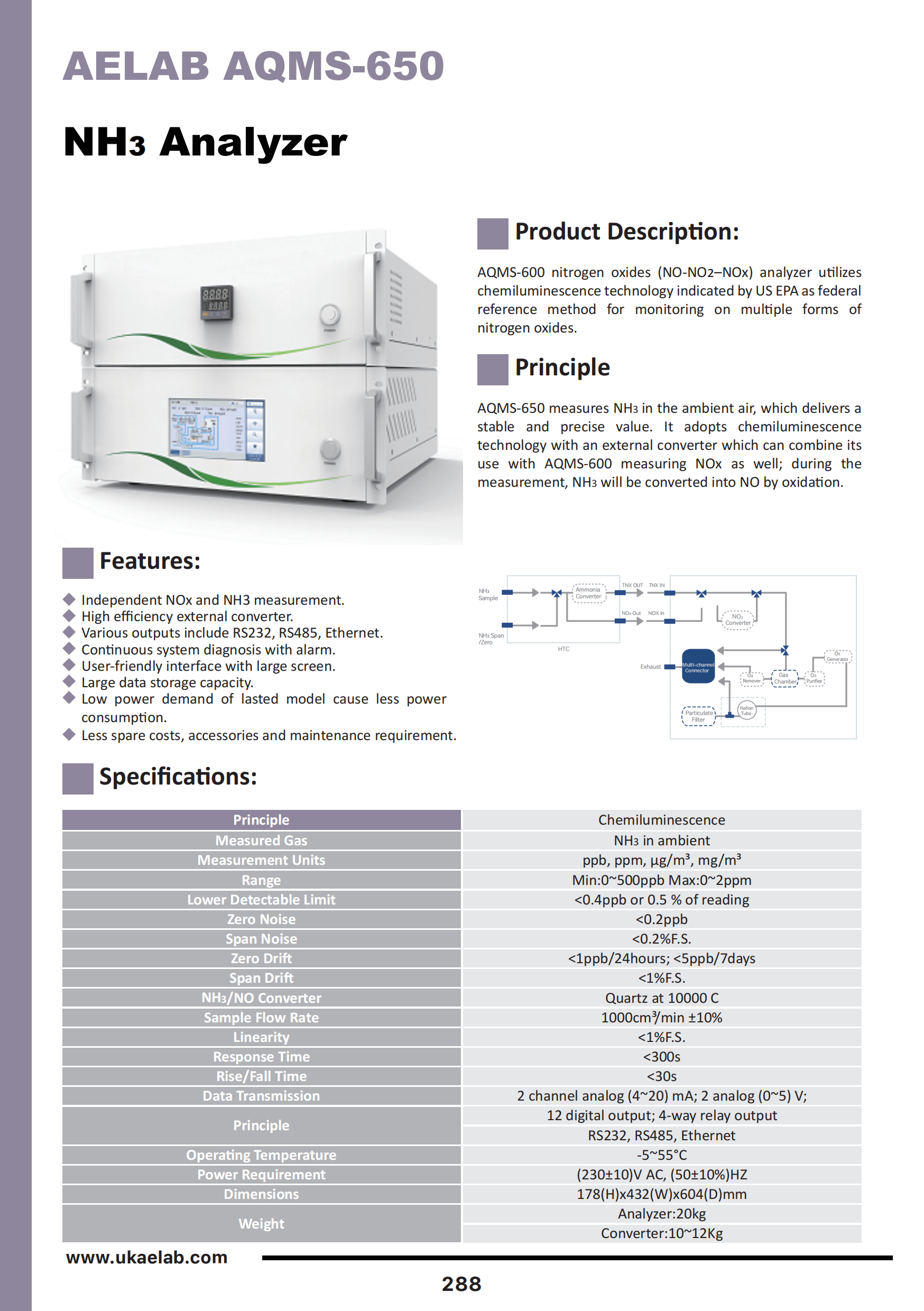 The AELAB AQMS-650 NH₃ Analyzer is designed for continuous ammonia gas quantification in environmental, agricultural, and industrial air monitoring systems. It employs chemiluminescence detection for precise and stable measurement of NH₃ and NOx concentrations, enabling compliance verification and emission assessment across a wide range of atmospheric conditions.