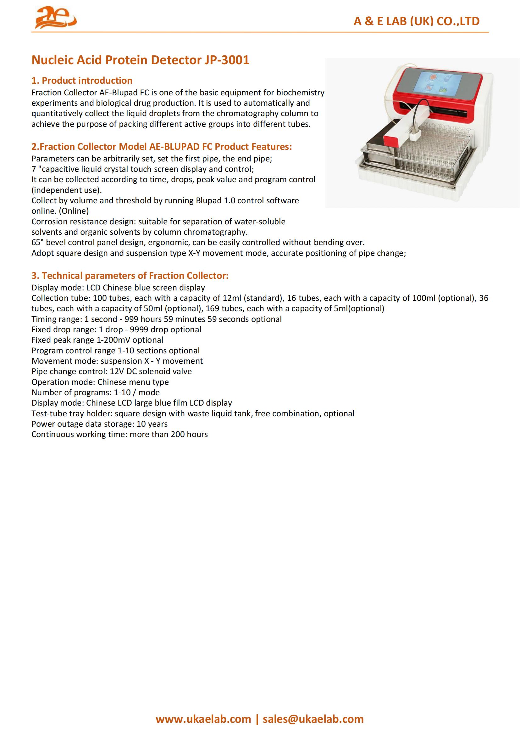The AELAB JP-3001 is suitable for biochemistry laboratories, pharmaceutical development, nucleic acid and protein purification workflows, chromatographic fractionation, and sample collection for downstream analytical testing. It is particularly effective for gradient elution collection, biomolecule separation, and automated preparative chromatography.