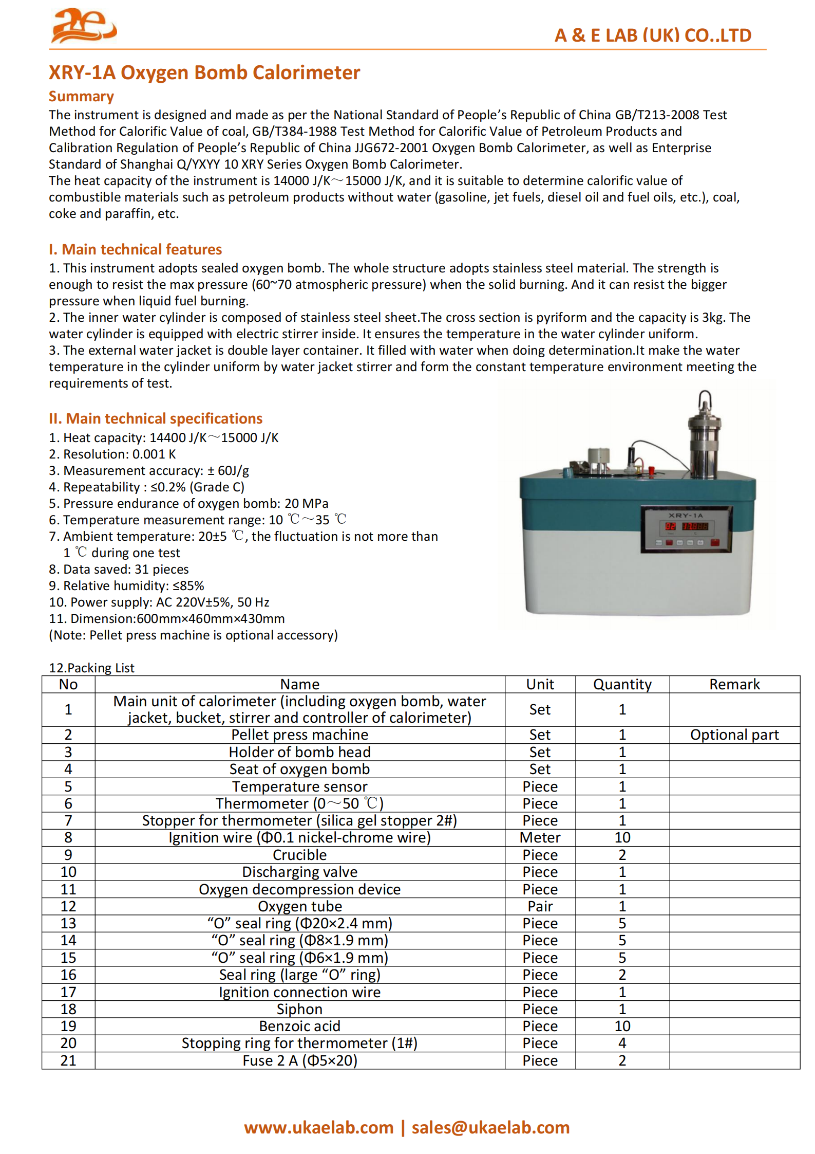 The AELAB Oxygen Bomb Calorimeter XRY-1A is engineered to meet the National Standards GB/T213-2008 and GB/T384-1988 for determining the calorific value of coal, petroleum products, and related materials. It also complies with JJG672-2001 and the Enterprise Standard of Shanghai Q/XYXY 10 XRY Series Oxygen Bomb Calorimeter. With a heat capacity of 14400 J/K ~ 15000 J/K, the XRY-1A ensures accurate and repeatable determination of fuel energy content for industrial and academic laboratories.