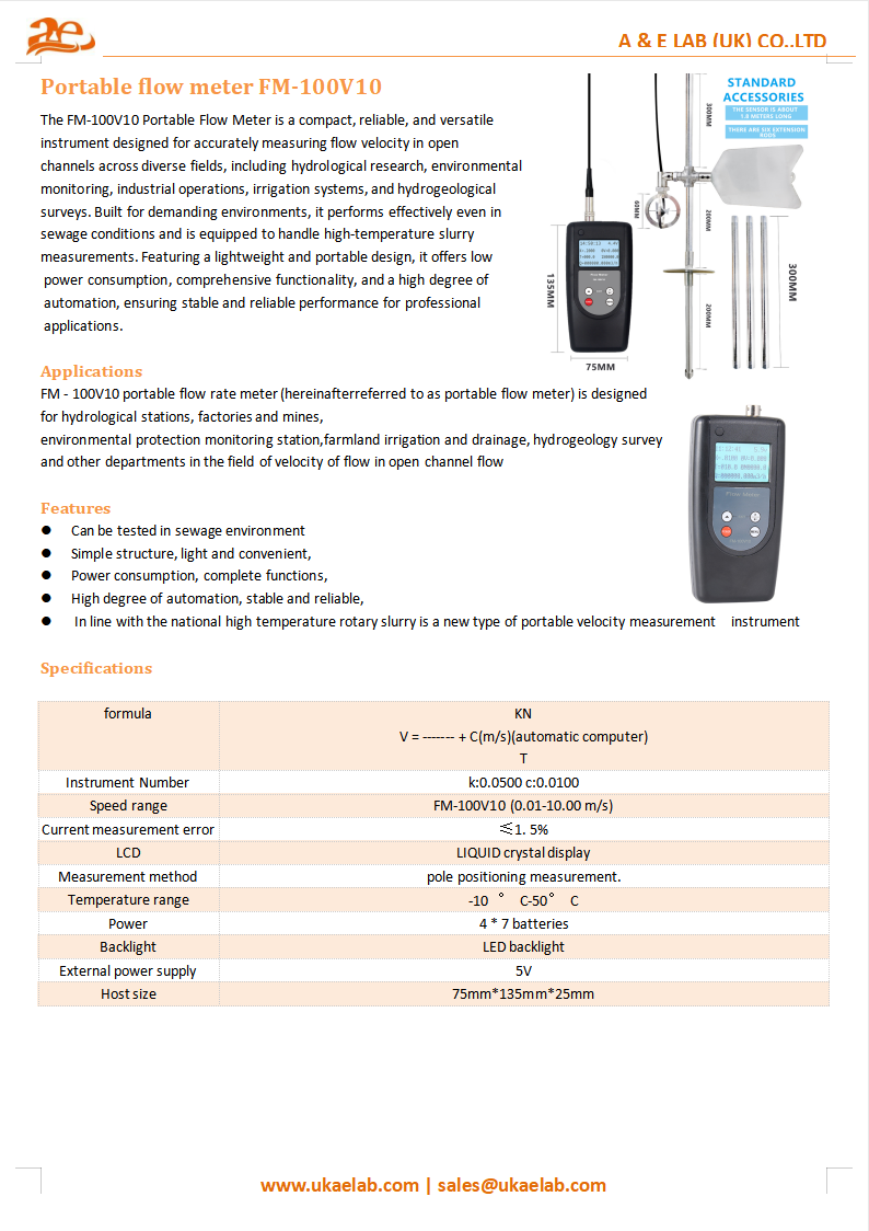 The FM-100V10 Portable Flow Meter is a compact, reliable, and versatile instrument designed for accurately measuring flow velocity in open channels across diverse fields, including hydrological research, environmental monitoring, industrial operations, irrigation systems, and hydrogeological surveys. Built for demanding environments, it performs effectively even in sewage conditions and is equipped to handle high-temperature slurry measurements. Featuring a lightweight and portable design, it offers low power consumption, comprehensive functionality, and a high degree of automation, ensuring stable and reliable performance for professional applications.