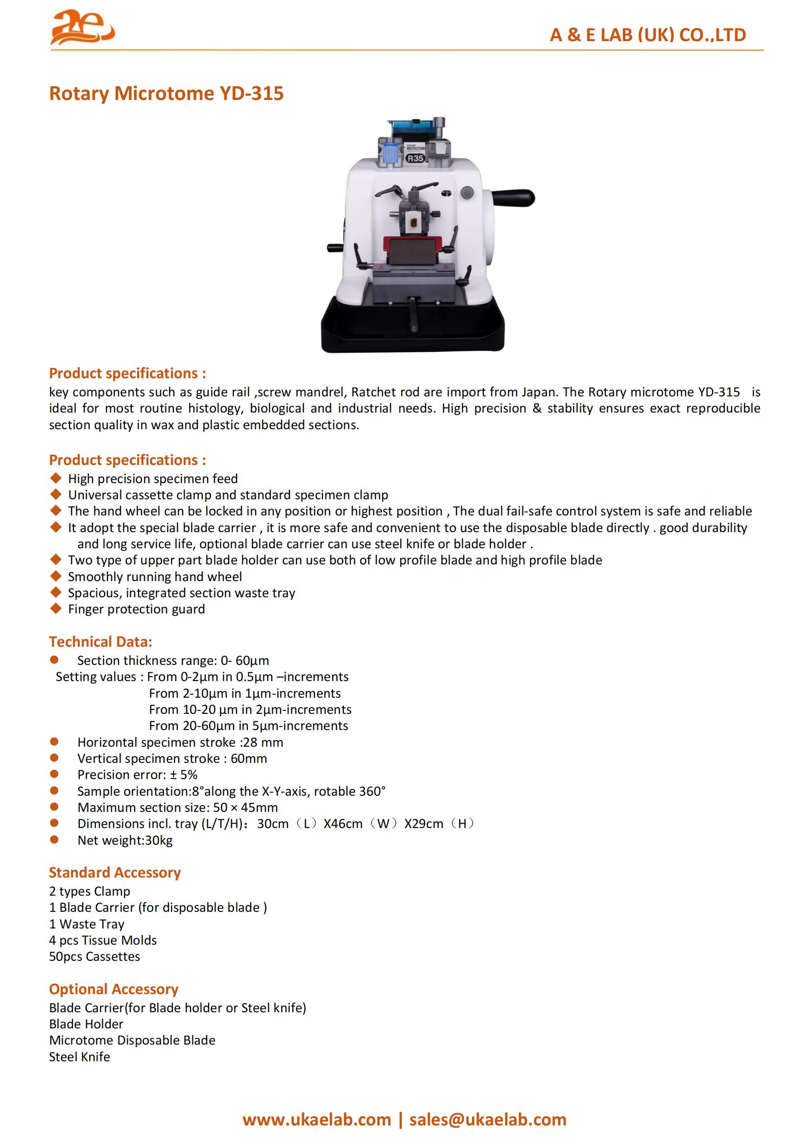 The Rotary Microtome YD-315 is a high-precision instrument tailored for routine histology and various biological and industrial applications. It features durable components such as guide rails, screw mandrels, and ratchet rods sourced from Japan, ensuring stability and reliability. With adjustable section thickness, it accommodates both wax and plastic-embedded specimens, delivering consistent, reproducible results. The ergonomic design enhances user experience, while built-in safety features ensure secure operation. Ideal for laboratories aiming for accuracy and efficiency in sample preparation.