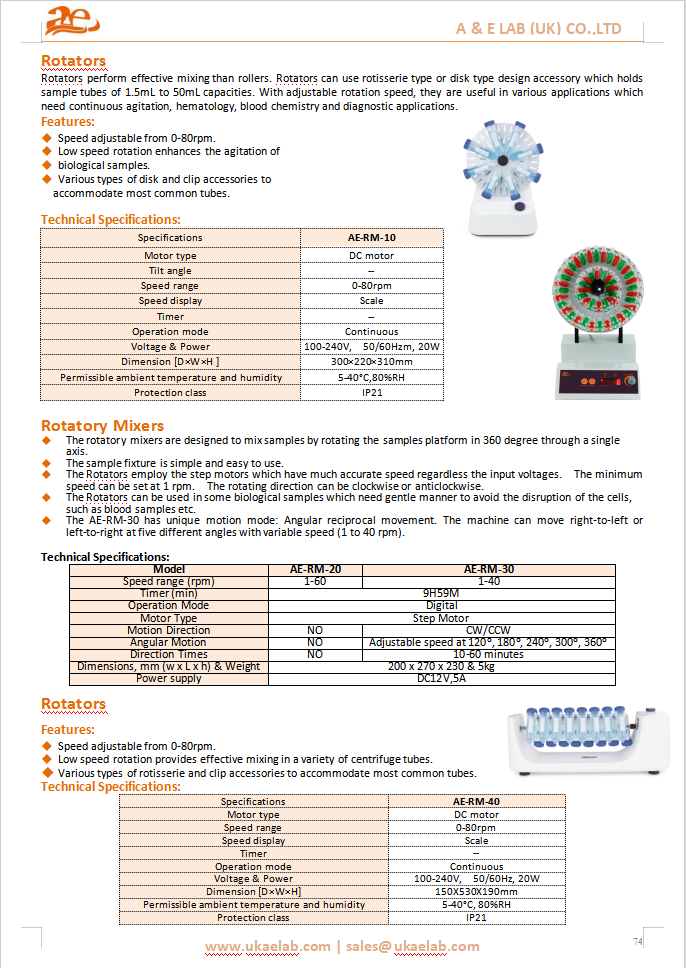 The AELAB Rotator AE-RM-10 is designed for reliable and efficient mixing of laboratory samples. With adjustable speeds from 0–80 rpm and a versatile design to accommodate various tubes, it ensures consistent suspensions and accurate results for research and diagnostics. Compact, durable, and easy to use, it is an essential tool for biological, chemical, and clinical laboratories.