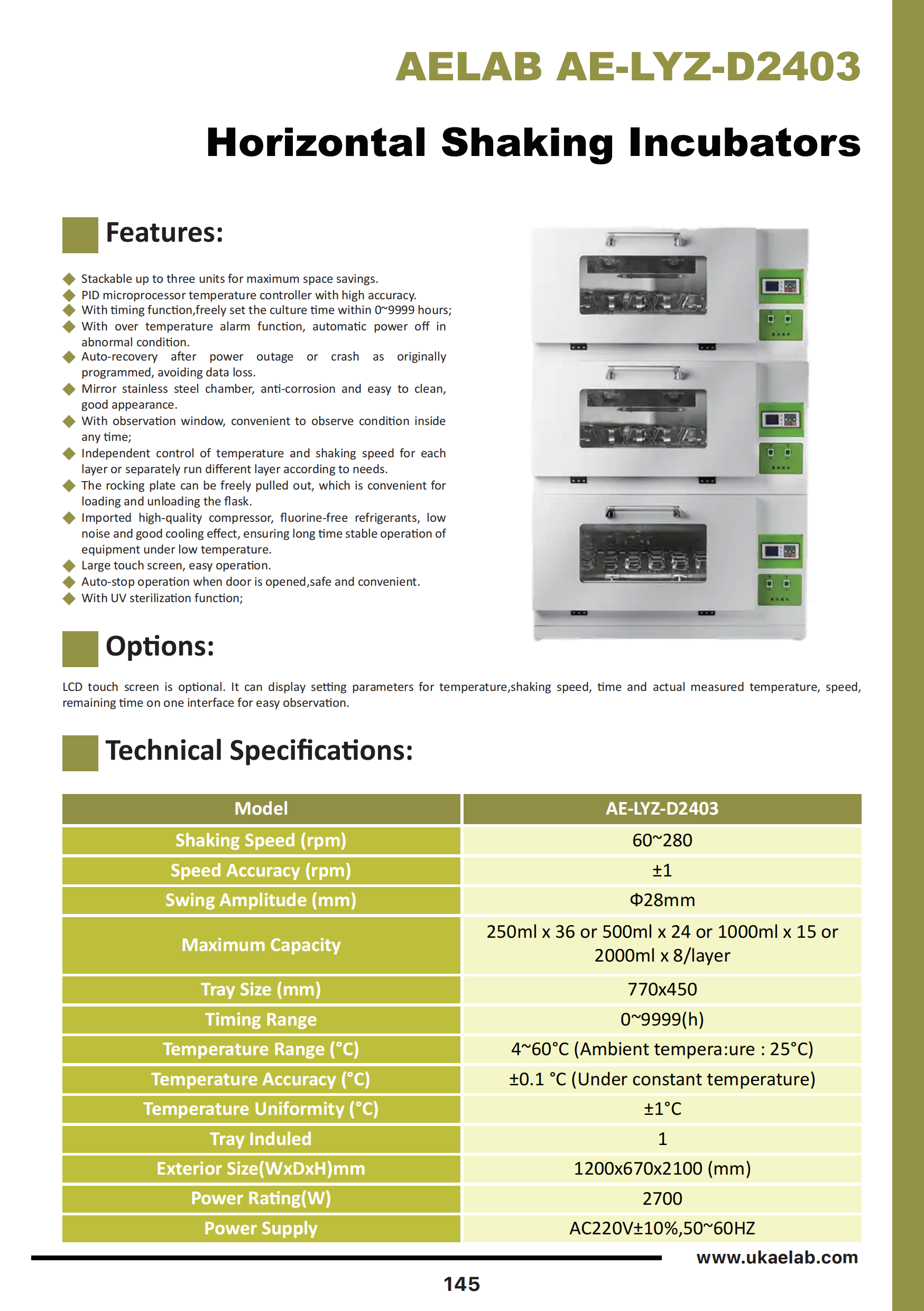 The AELAB AE-LYZ-D2403 Horizontal Shaking Incubator delivers precise temperature regulation and consistent shaking for optimal microbial growth and chemical reactions. Its stackable design, advanced PID controller, and user-friendly touchscreen make it ideal for labs seeking accuracy and efficiency.