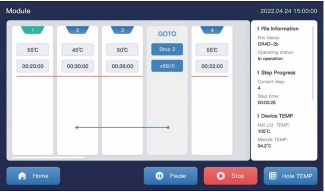 The system regulates temperature through programmable steps for denaturation, annealing, and extension. Using Peltier-based thermal control, the block transitions rapidly between setpoints while ensuring uniformity at 55°C. Gradient-enabled models (TC1000-G and TC1000-G-Pro) apply a calibrated temperature differential of 1–42°C across the block for annealing optimization, supporting high-throughput protocol development for gene amplification and mutation analysis.