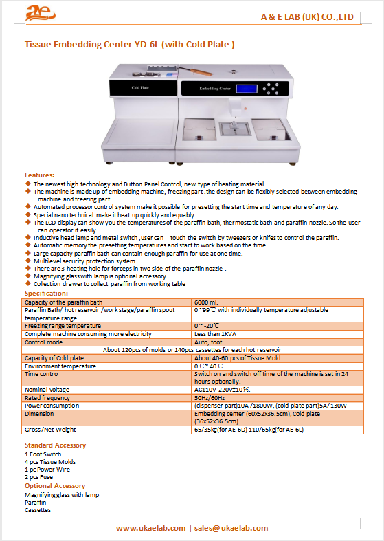 The Tissue Embedding Center YD-6L features a cold plate that aids in the quick cooling of embedded samples. This unit offers a heated working area for optimal paraffin consistency while the cold plate ensures efficient solidification. Its intuitive controls and spacious design facilitate easy handling and organization of molds and tissue samples, reducing the risk of contamination. The YD-6L is essential for labs aiming for high-quality tissue preparation and precise histological analysis.