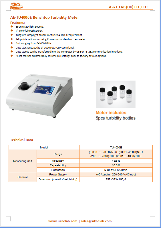 The AELAB Turbidity Meter AE-TU4000E offers benchtop measurement of liquid turbidity up to 4000 NTU with high accuracy. Featuring a 7” touchscreen and tungsten lamp light source meeting USEPA 180.1 standards, it supports rigorous environmental, industrial, and water treatment applications.