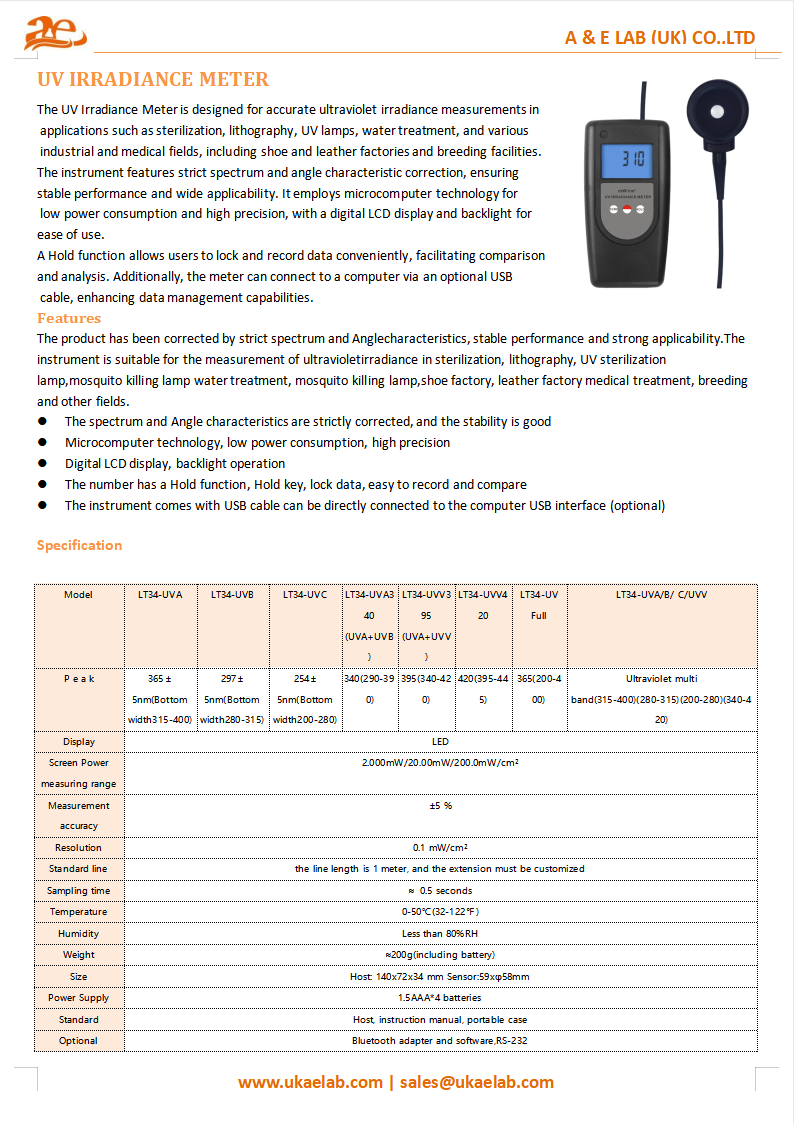 The AELAB UV Irradiance Meter LT34-UVA is engineered for accurate and reliable ultraviolet light measurements in a variety of industrial, medical, and scientific applications. With strict spectrum and angle corrections, this device offers high precision and low power consumption, making it the perfect tool for UV-related operations in fields such as sterilization, lithography, and water treatment.