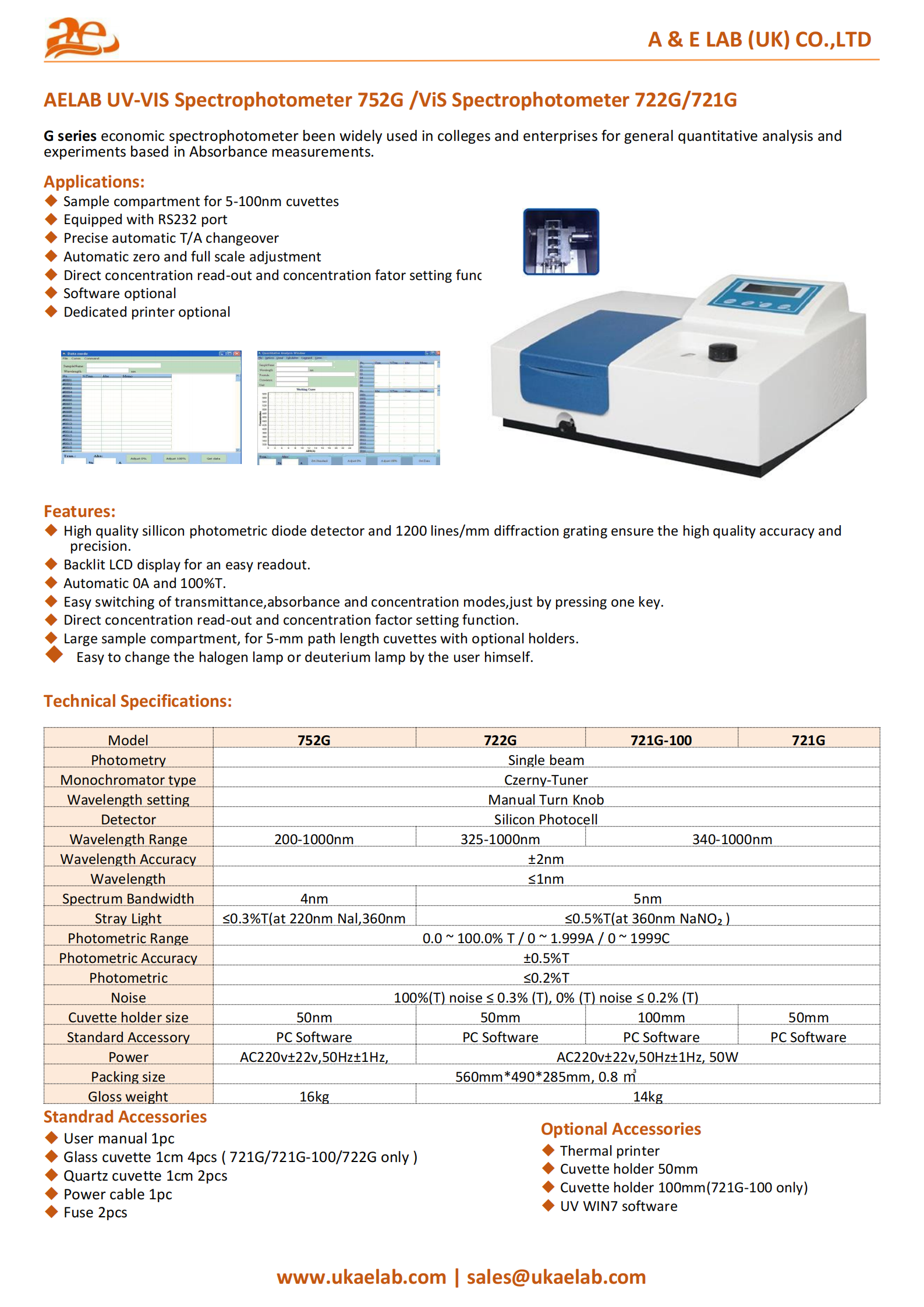 The AELAB UV-VIS Spectrophotometer 752G/722G/721G is an economic spectrophotometer widely used in colleges and enterprises for general quantitative analysis and absorbance-based experiments. It features a sample compartment for 5-100mm cuvettes, precise automatic T/A changeover, automatic zero/full scale adjustment, and direct concentration read-out with concentration factor setting. The instrument also offers RS232 connectivity, optional software, and a dedicated printer for enhanced functionality.