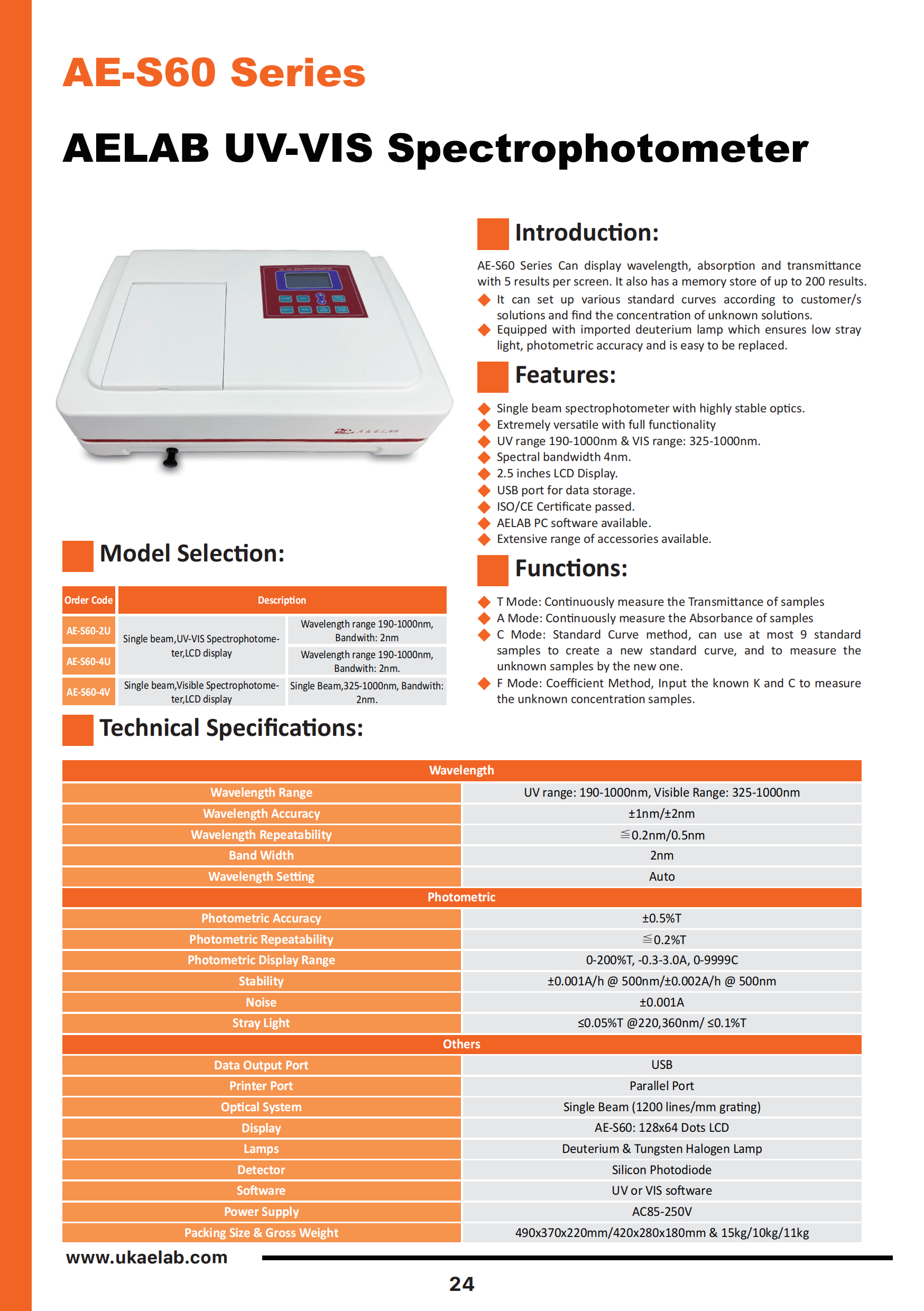 | AE-S60-4V | Single beam,Visible Spectrophotometer,LCD display | Single Beam,325-1000nm, Bandwith: 2nm. |