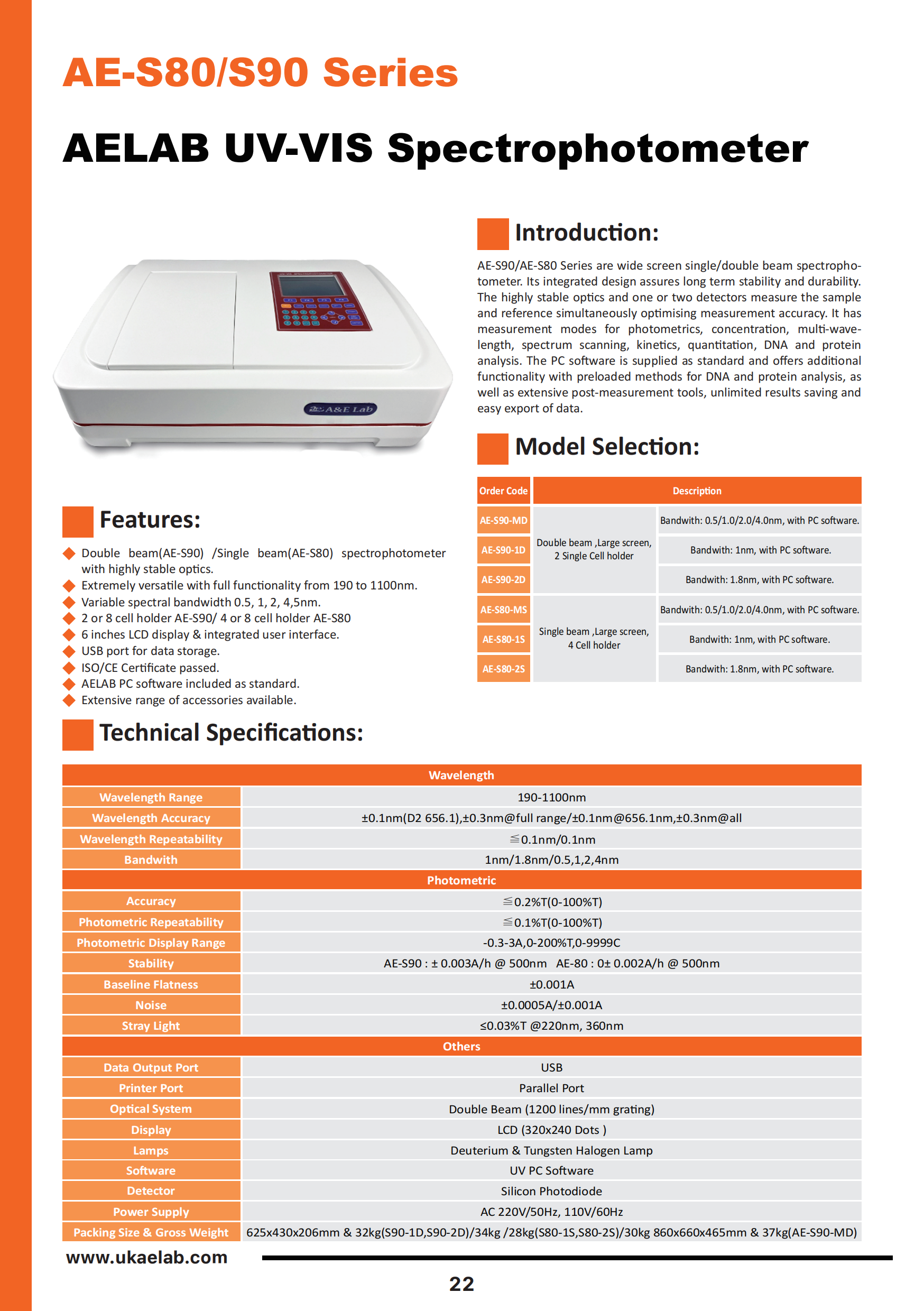 Double Beam UV-VIS spectrophotometers AE-S80 AE-S90 Series are wide screen single/double beam spectrophotometer. Its integrated design assures long term stability and durability. The highly stable optics and one or two detectors measure the sample and reference simultaneously optimising measurement accuracy. It has measurement modes for photometrics, concentration, multi-wavelength, spectrum scanning, kinetics, quantitation, DNA and protein analysis. The PC software is supplied as standard and offers additional functionality with preloaded methods for DNA and protein analysis, as well as extensive post-measurement tools, unlimited results saving and easy export of data.