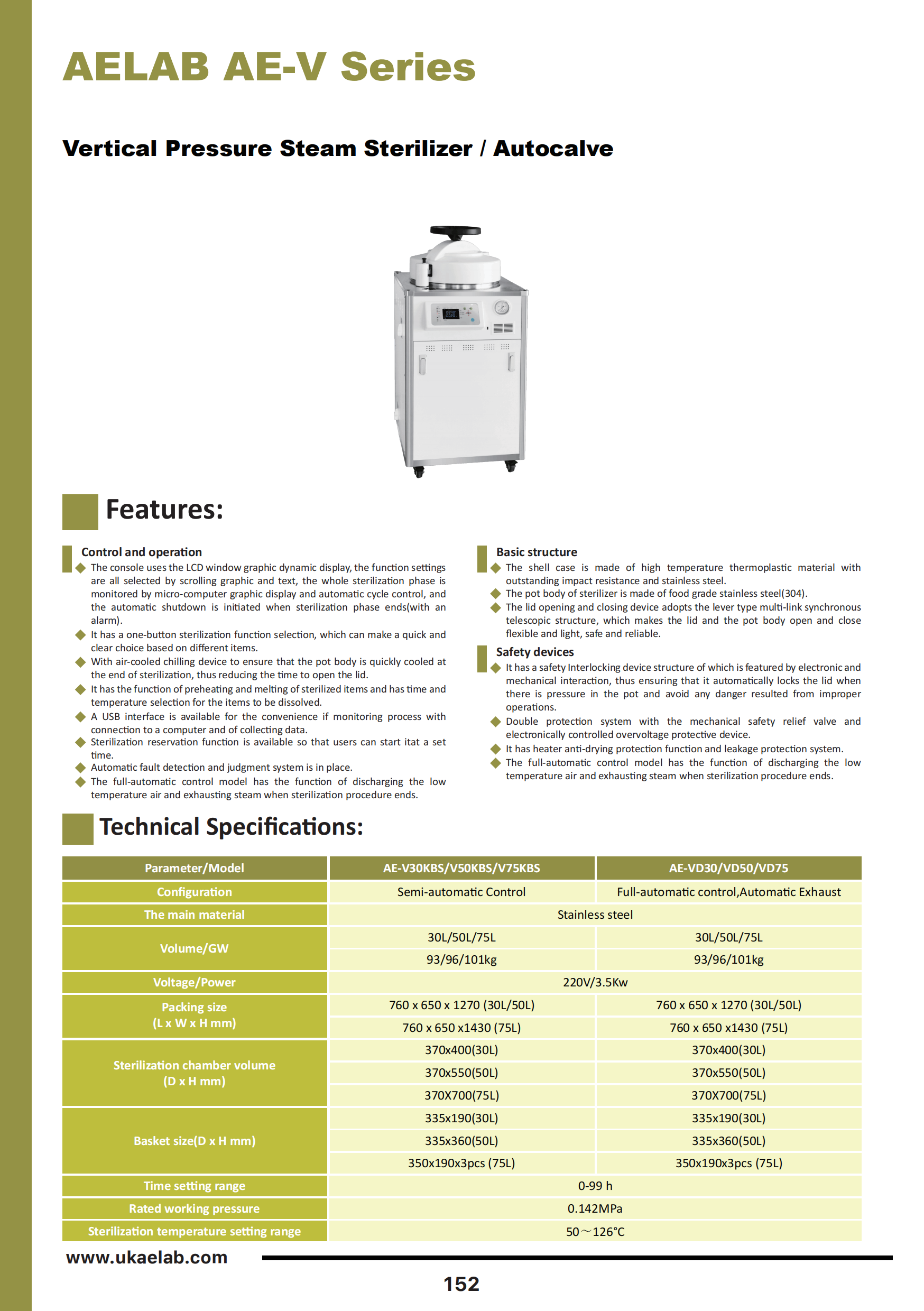 Key features of the AE-V series include an advanced control system that provides precise temperature and pressure regulation, ensuring optimal sterilization conditions. The unit typically comes with a user-friendly interface, allowing for easy operation and monitoring. It also includes safety features such as automatic pressure release and over-temperature protection to safeguard both the equipment and the user.