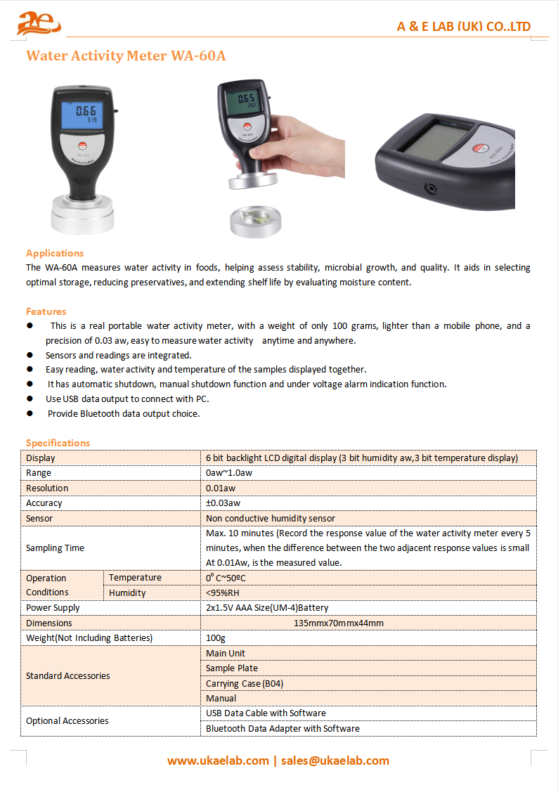 The WA-60A Water Activity Meter is designed for precise measurement of water activity in foods. It provides valuable insights into the amount of free water present, which directly impacts food stability, microbial growth, and quality changes due to chemical, enzymatic, or physical processes. By measuring water activity, it helps determine optimal storage and packaging methods, reducing the need for preservatives and extending shelf life. Ideal for evaluating the dryness tolerance of microorganisms, the WA-60A is a reliable tool for assessing food quality, grain, and produce freshness.