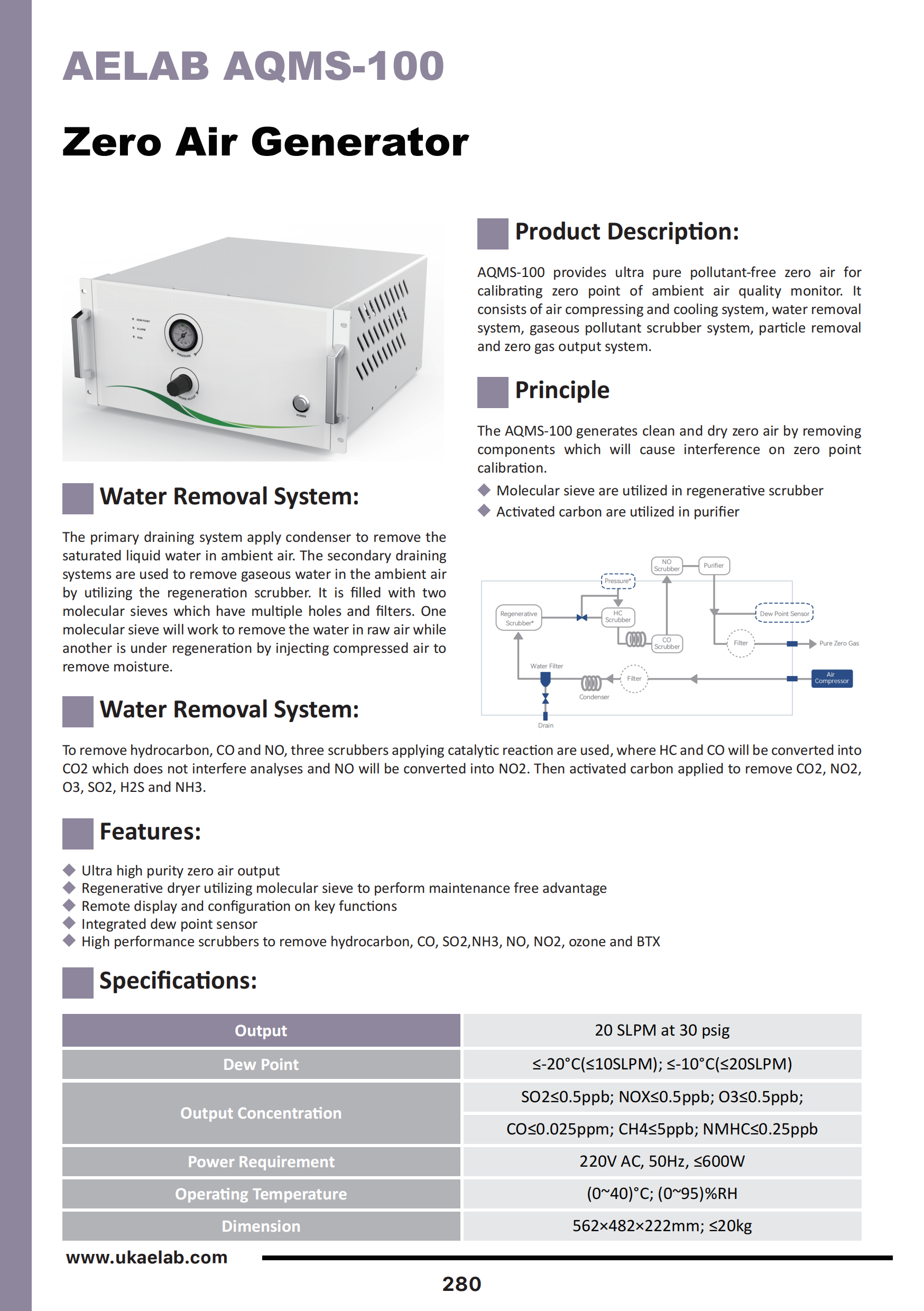 | Output Concentration | SO₂ ≤ 0.5 ppb; NOx ≤ 0.5 ppb; O₃ ≤ 0.5 ppb; CO ≤ 0.025 ppm; CH₄ ≤ 5 ppb; NMHC ≤ 0.25 ppb |